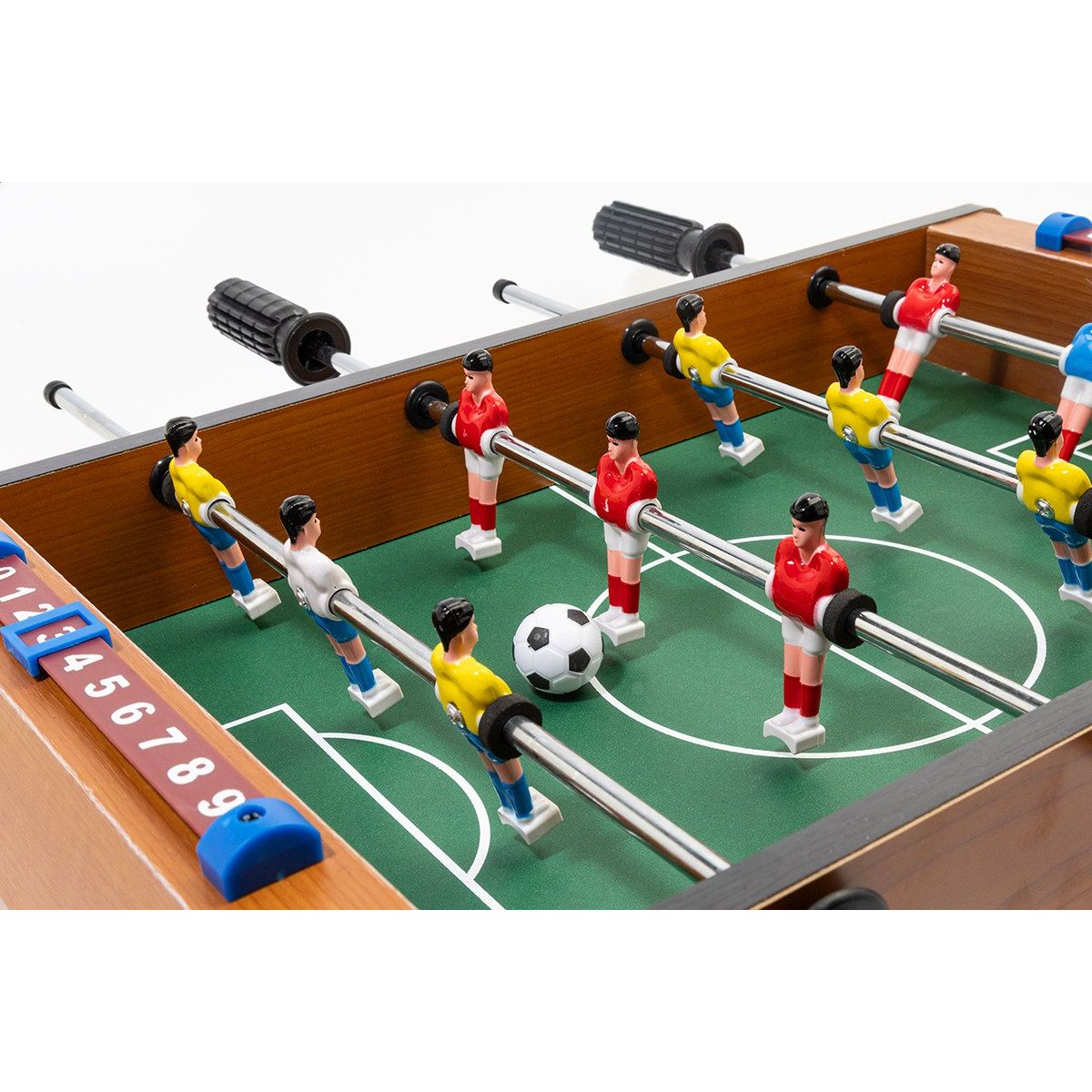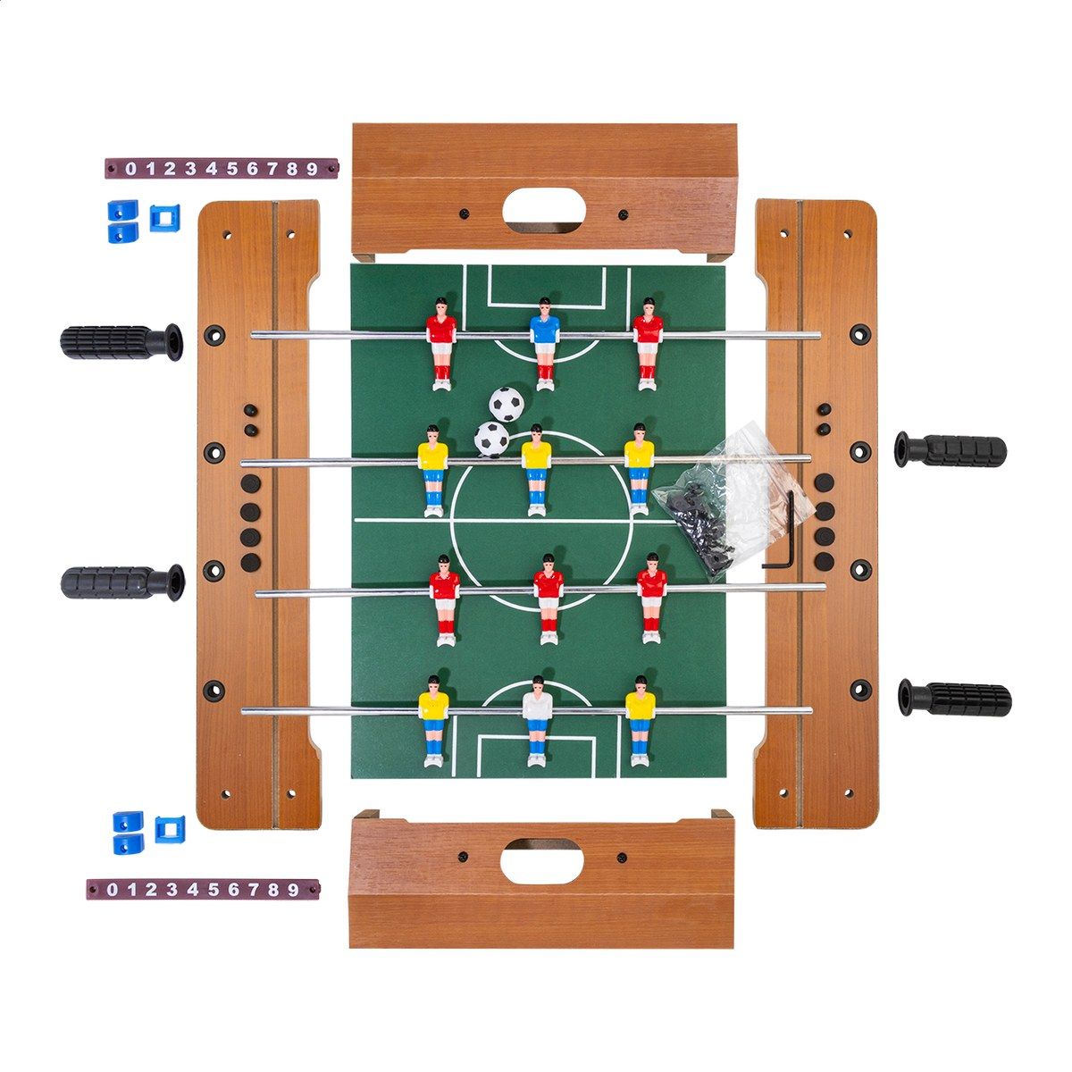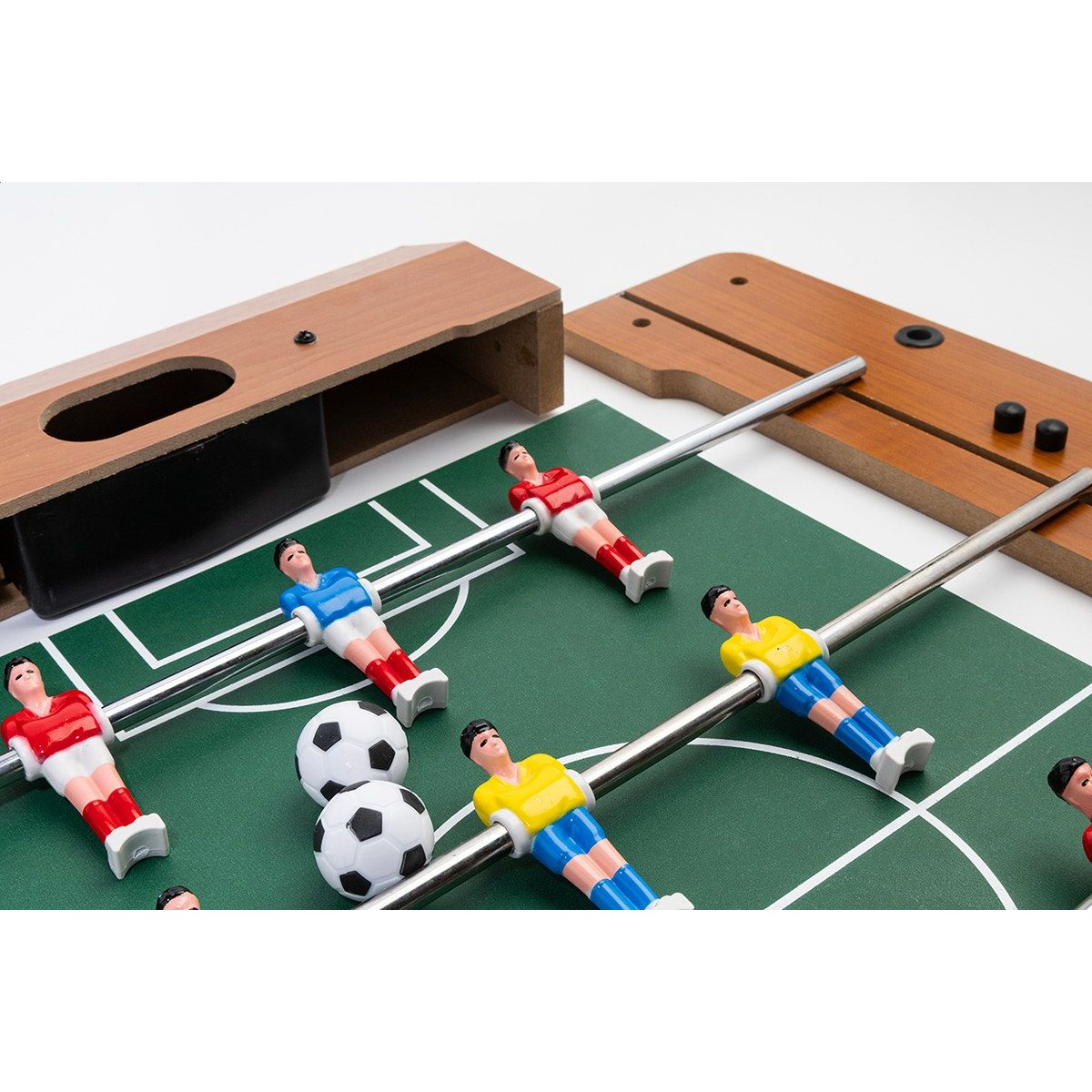 Mini stolní fotbal vyrobený z MDF dřeva. Obsahuje 2 míčky a posuvné počítadlo skóre. Dodává se v rozloženém stavu, vyžaduje montáž.
