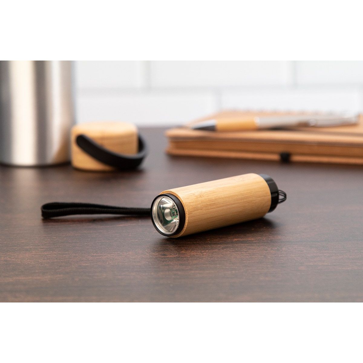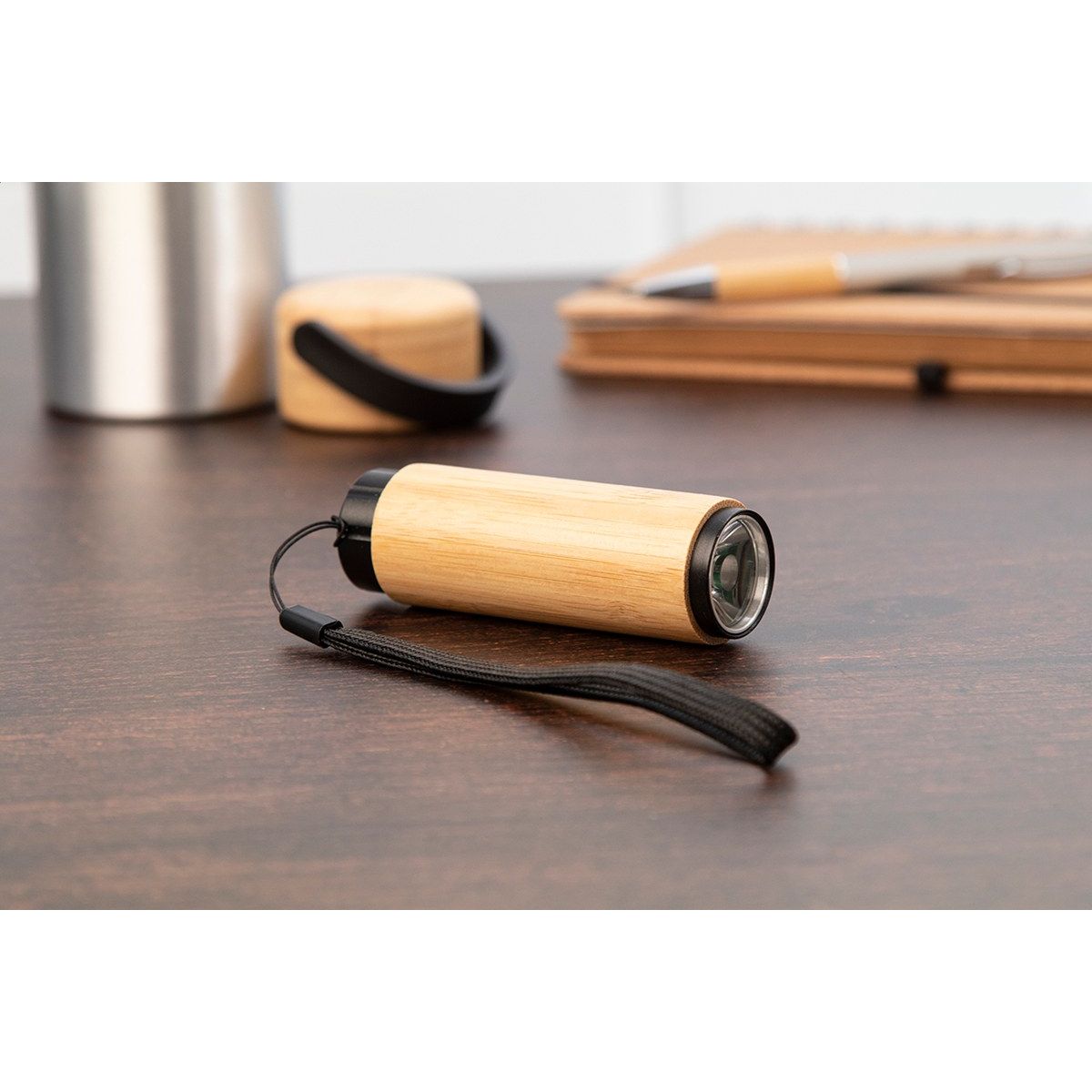 Bambusová hliníková baterka s COB LED a poutkem. Se 3 bateriemi AAA.