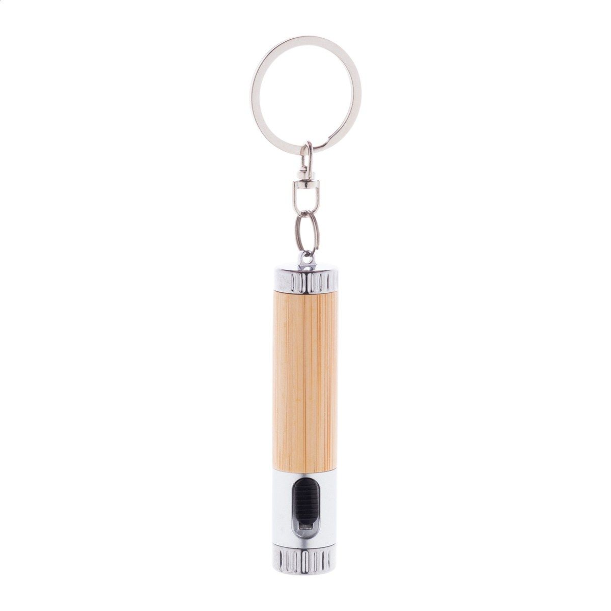 Mini svítilna z bambusu a recyklovaného ABS plastu s 1 LED a kovovým kroužkem na klíče. S knoflíkovou baterií.