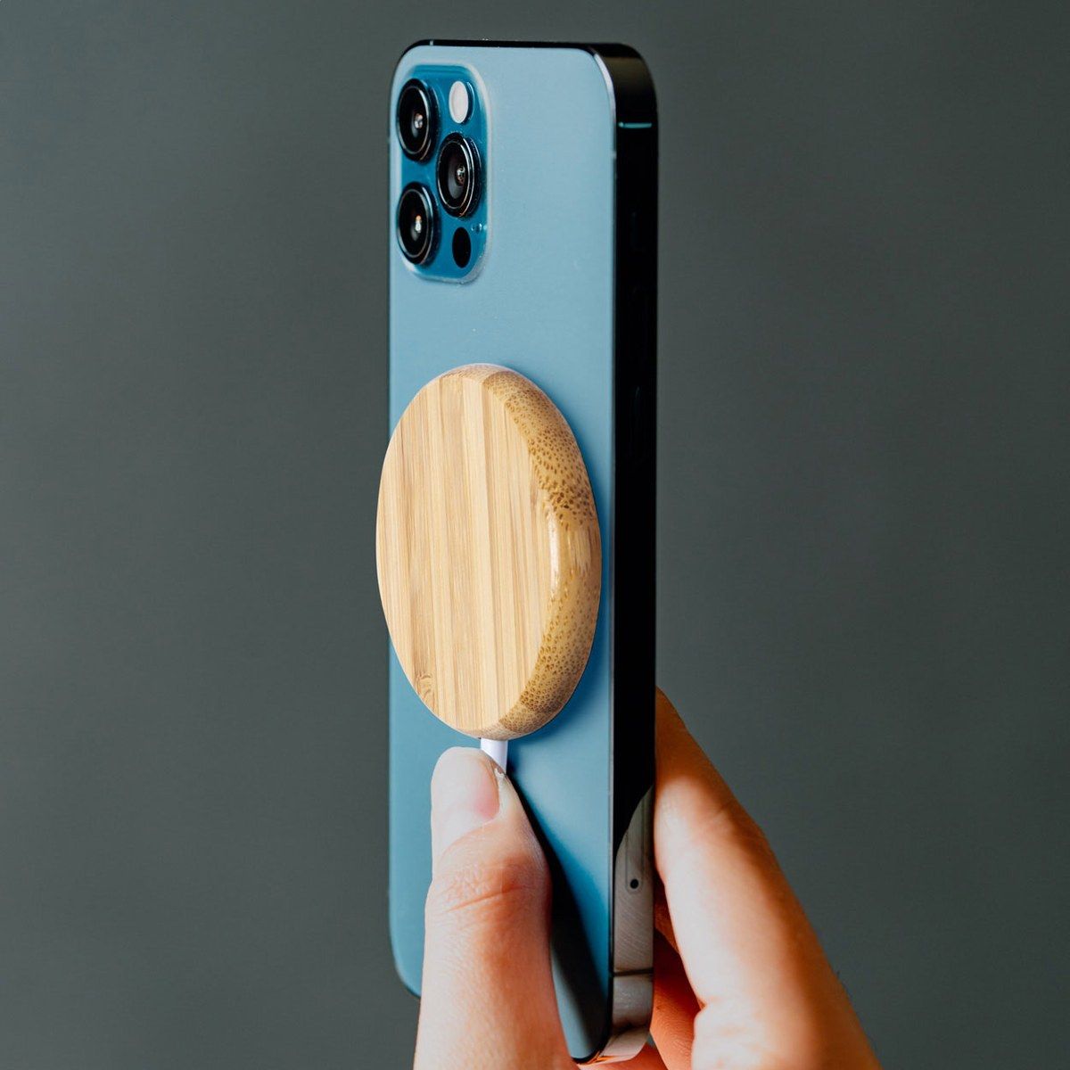 Magnetická bezdrátová rychlá nabíječka (10W) v bambusovém pouzdře s LED kontrolkou nabíjení. Včetně samolepicího kovového kroužku pro použití magnetické funkce na jakémkoli bezdrátově nabíjitelném zařízení. Včetně USB nabíjecího kabelu.