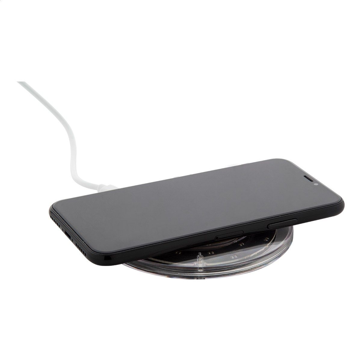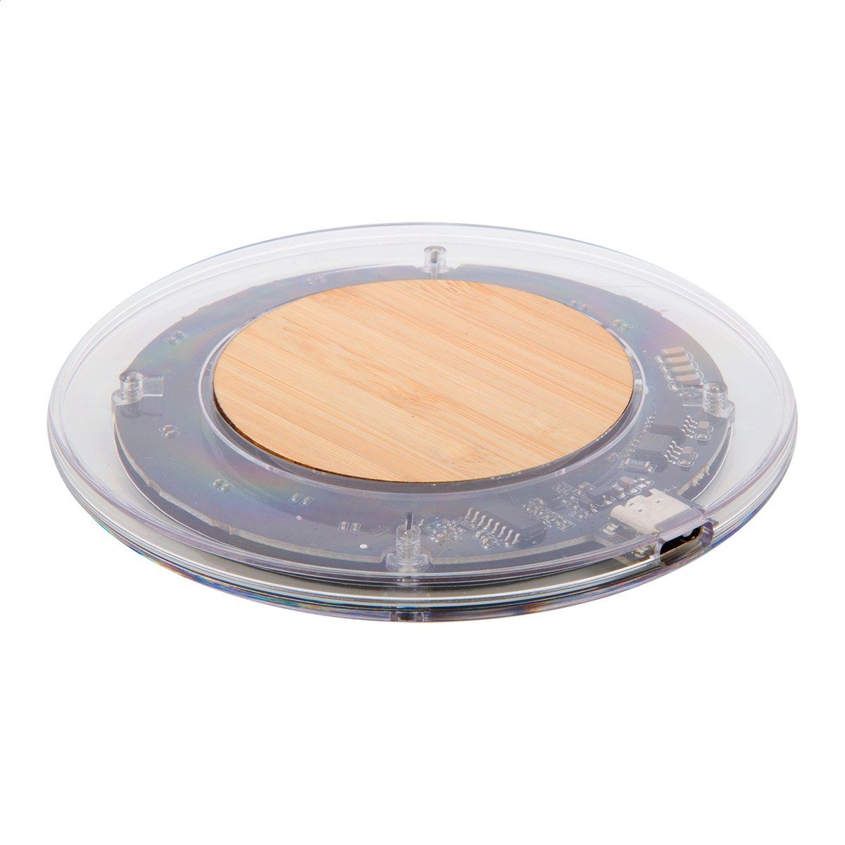 Bezdrátová rychlonabíječka (15W) v průhledném plastovém a bambusovém pouzdře s viditelnými elektronickými součástkami. Včetně USB nabíjecího kabelu.