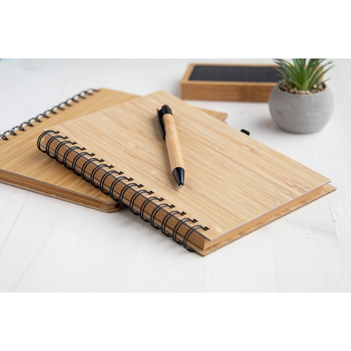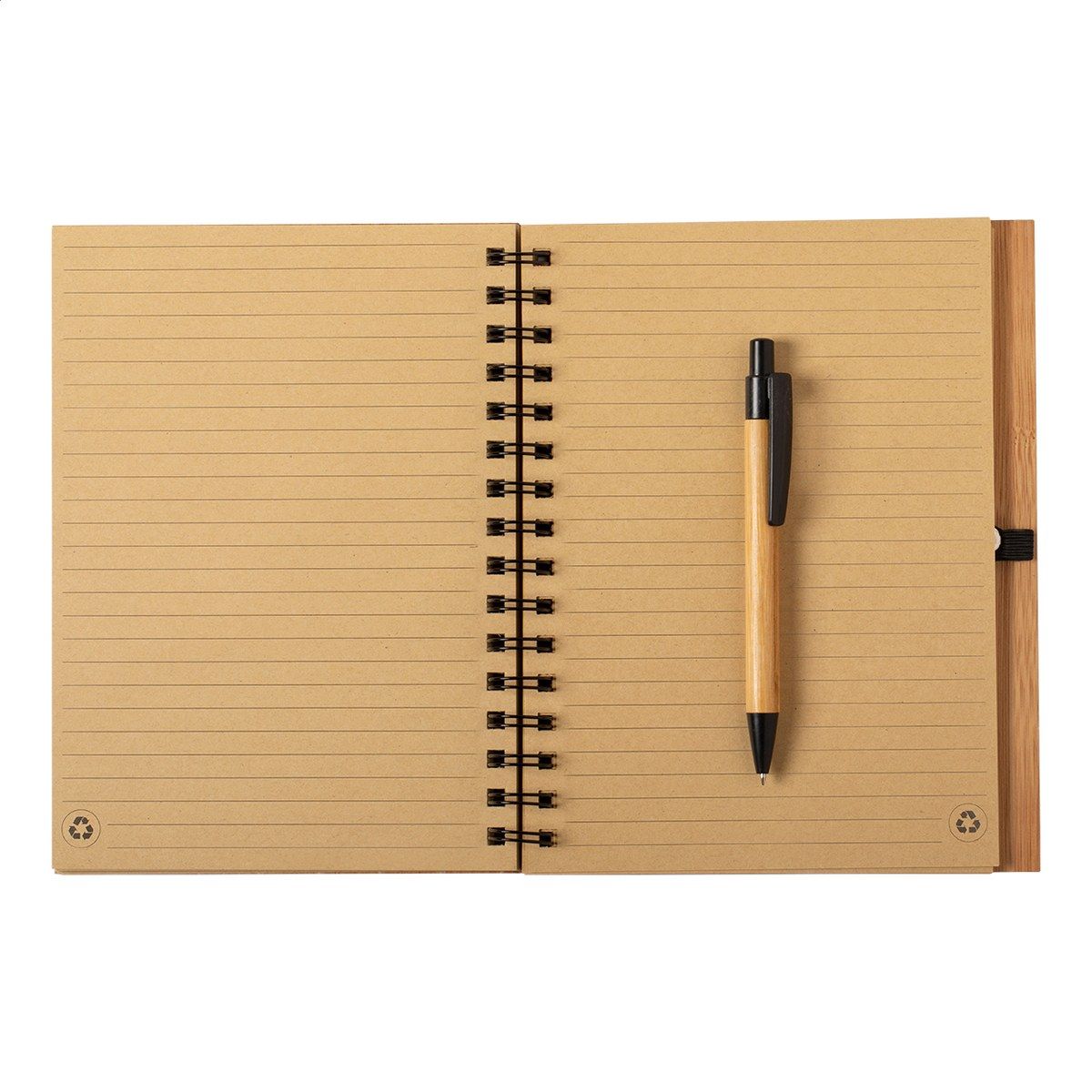 Blok A5 se spirálou v bambusových deskách s 80 linkovanými listy. Vč. kuličkového pera z bambusu s černou náplní.
