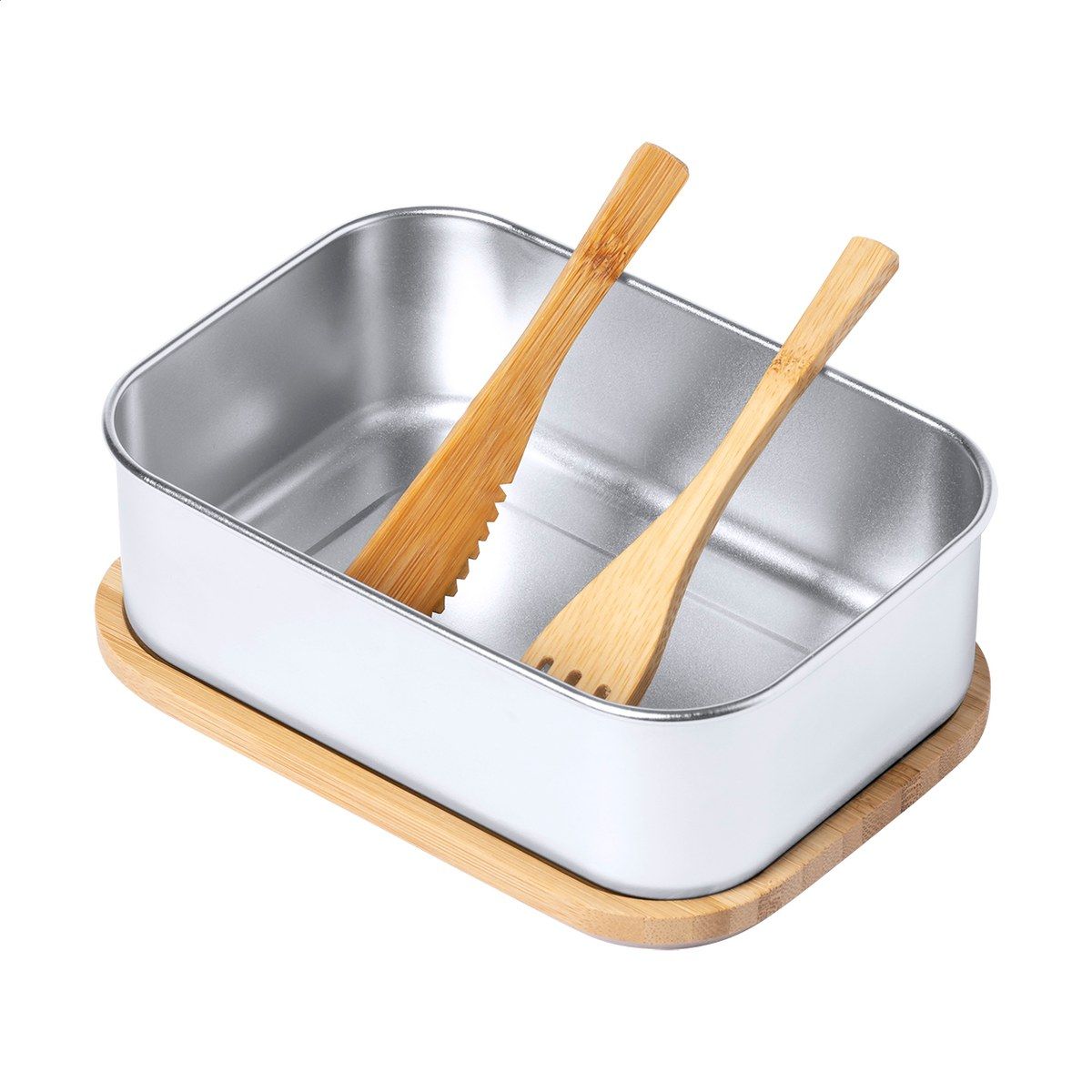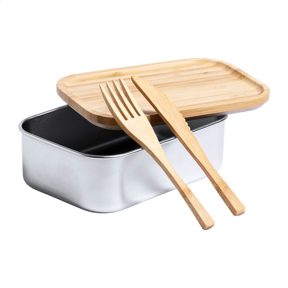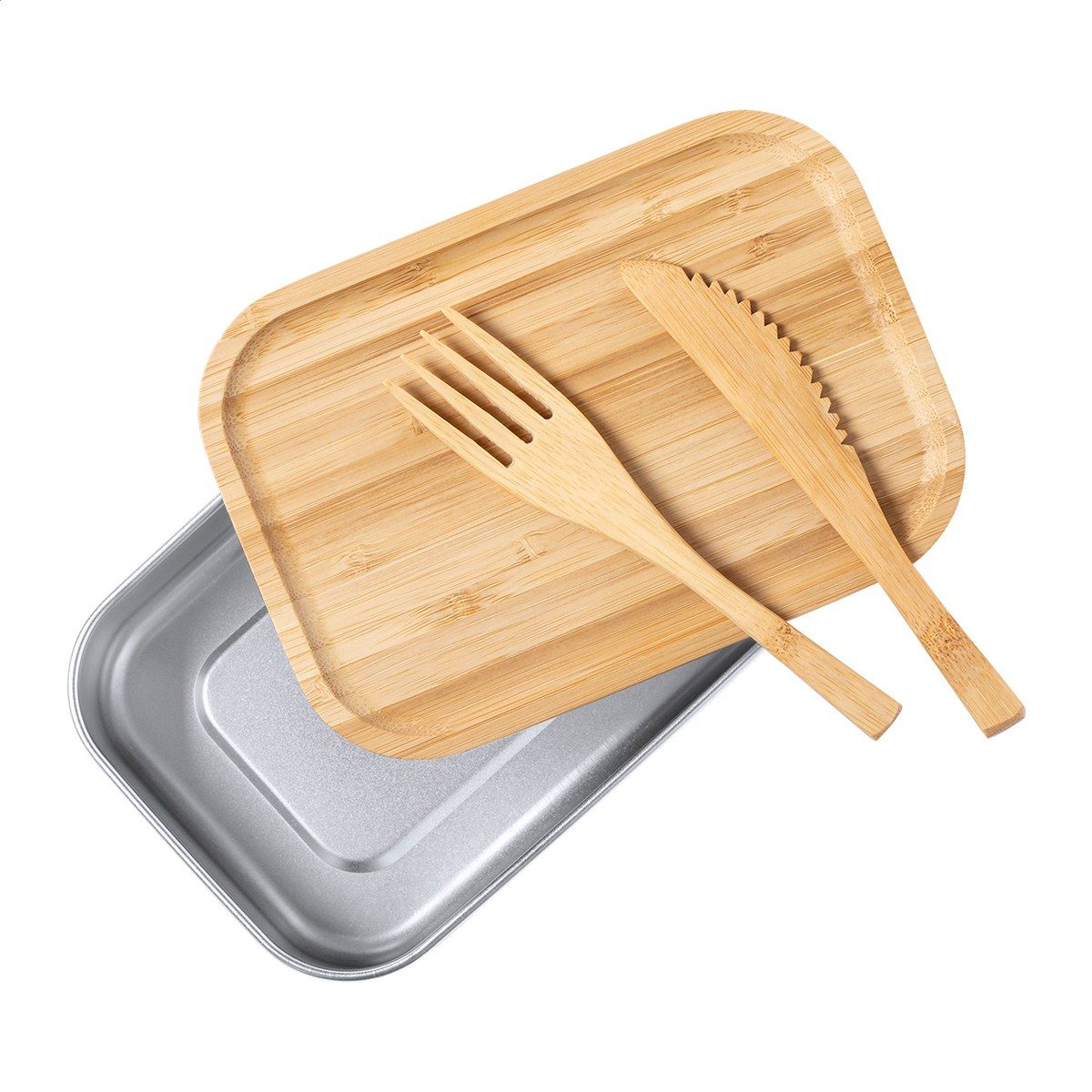 Box na jídlo z nerezové oceli s přírodním bambusovým víkem. Se sadou bambusových příborů (nůž a vidlička) a elastickým popruhem, 600 ml.