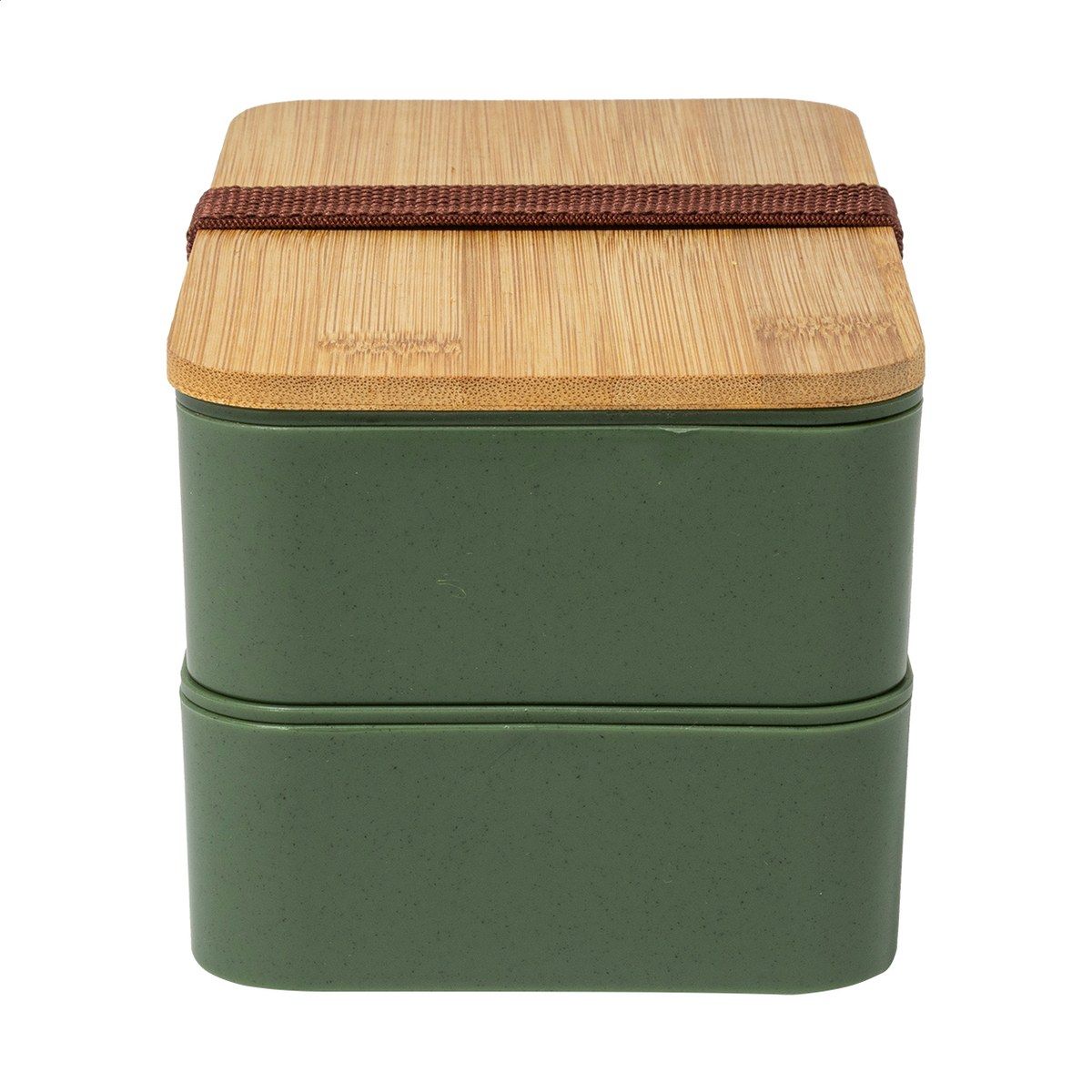 Box na jídlo z PP plastu se sadou příborů (vidlička, lžíce a nůž), bambusovým víkem a elastickým popruhem. Se 2 přihrádkami o objemu 700 ml.