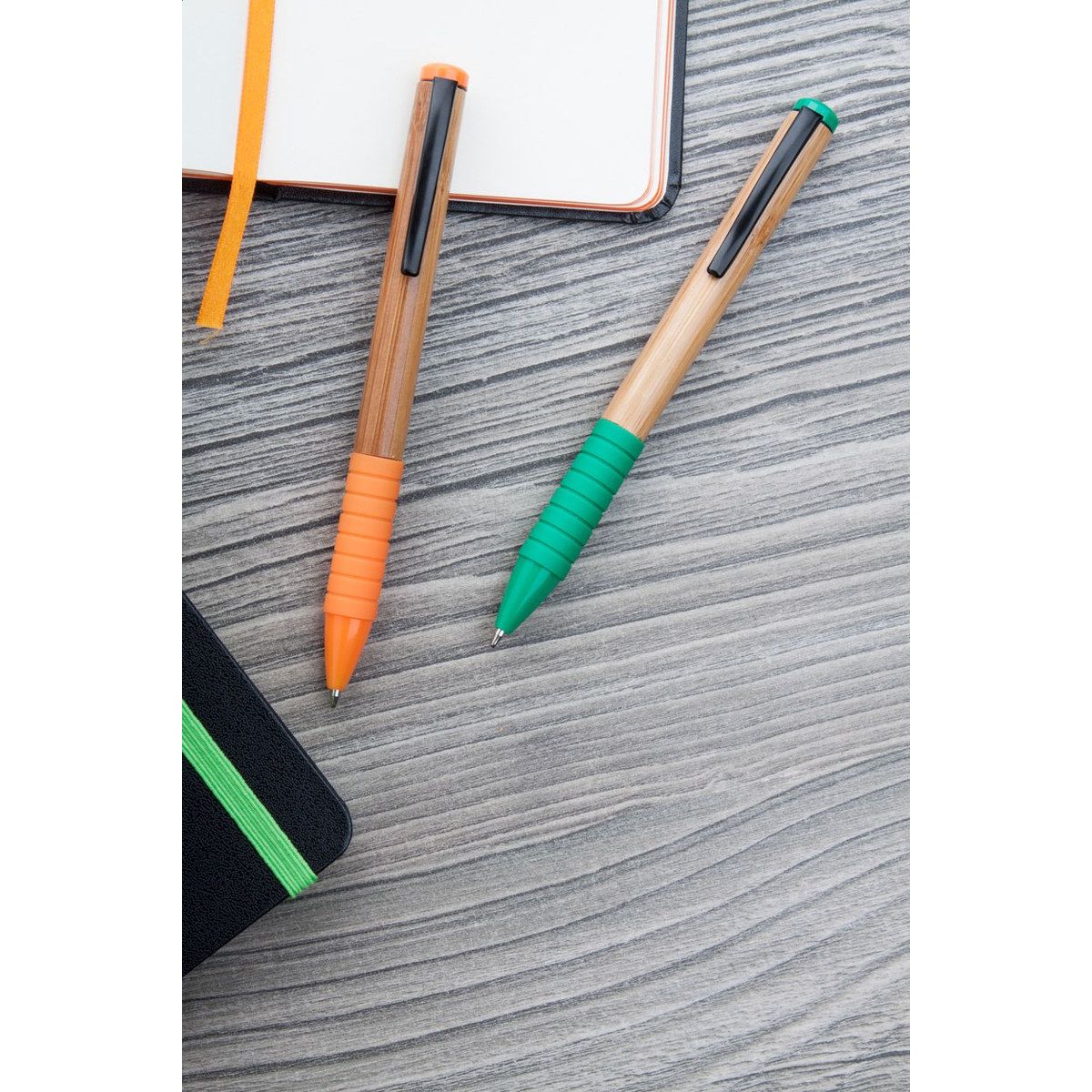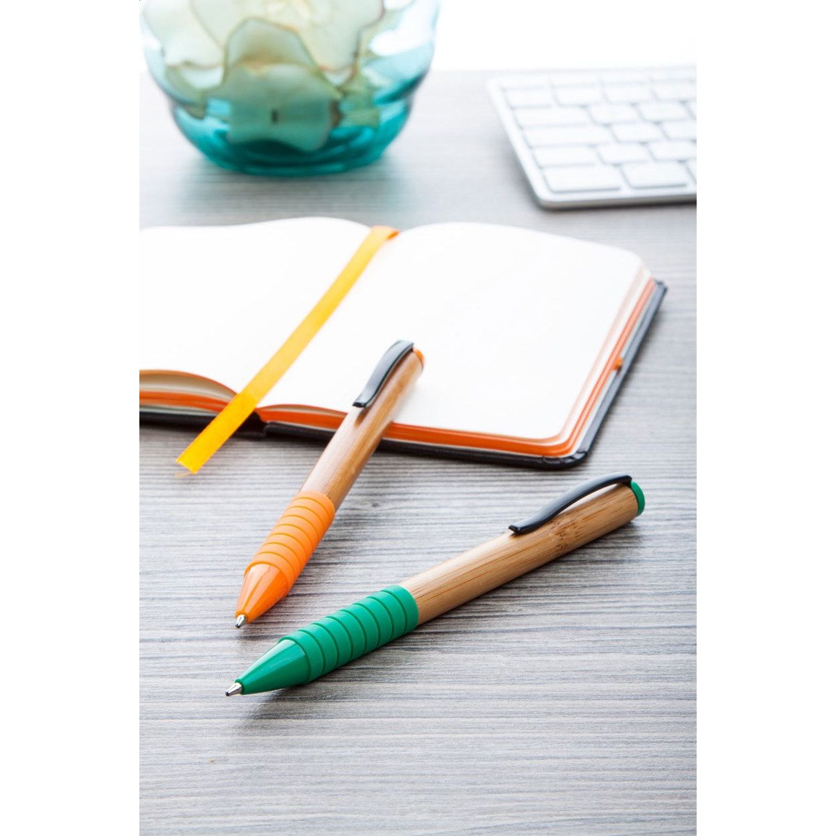 Bambusové twist kuličkové pero s kovovým klipem, barevnou špičkou a vrškem, barevným pogumovaným úchopem. S modrou náplní.
