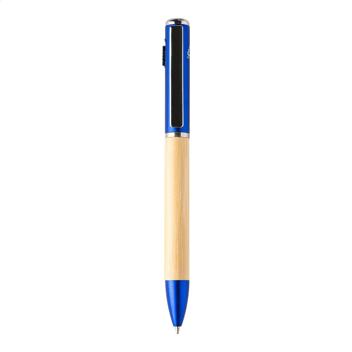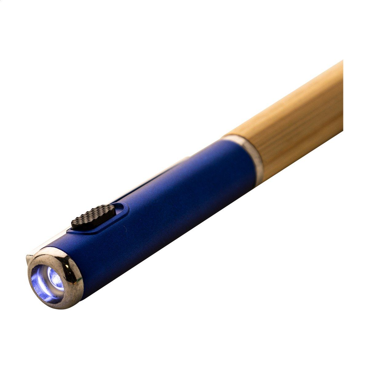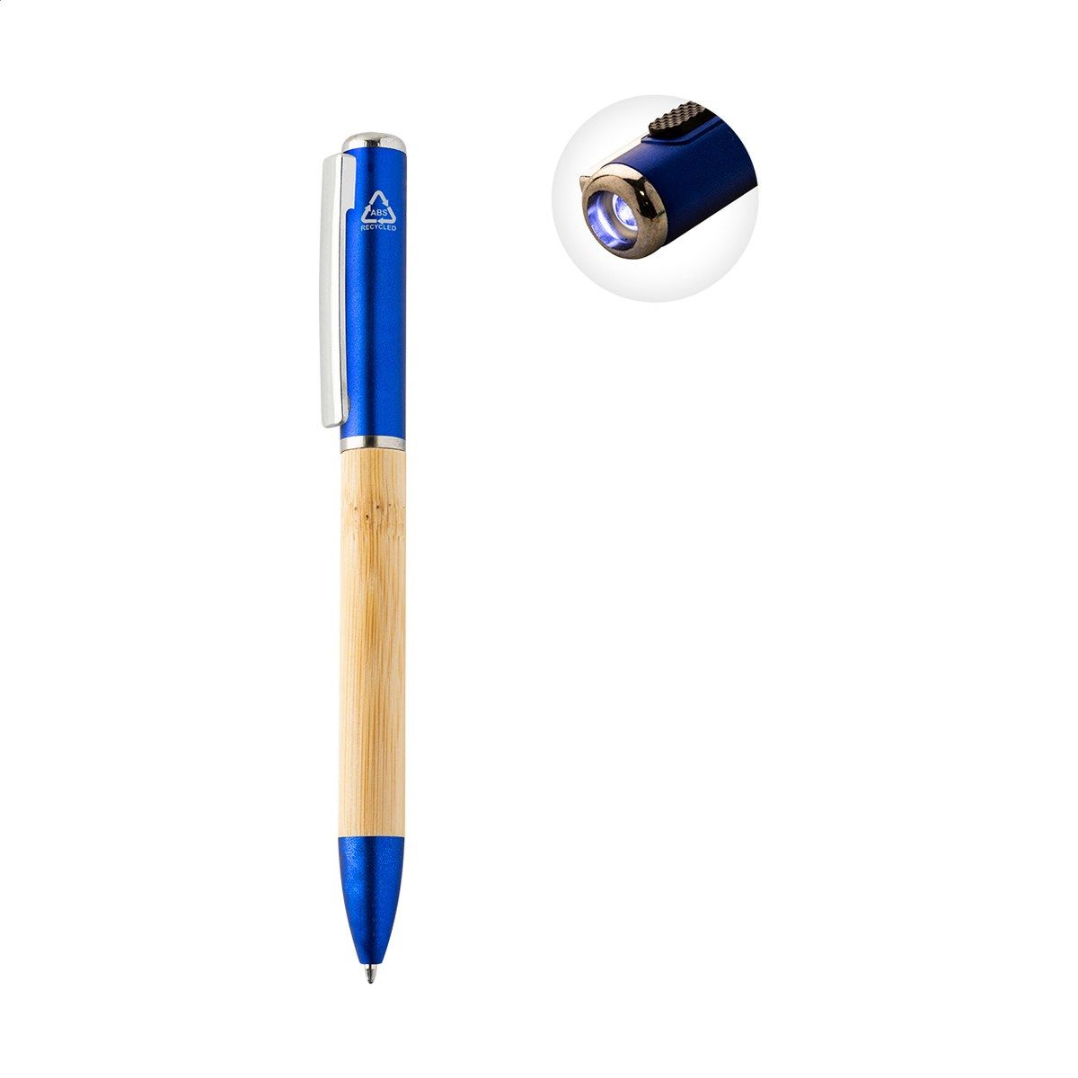 Kuličkové pero z bambusu a recyklovaného ABS plastu s 1 LED svítilnou. S modrou náplní a knoflíkovou baterií.