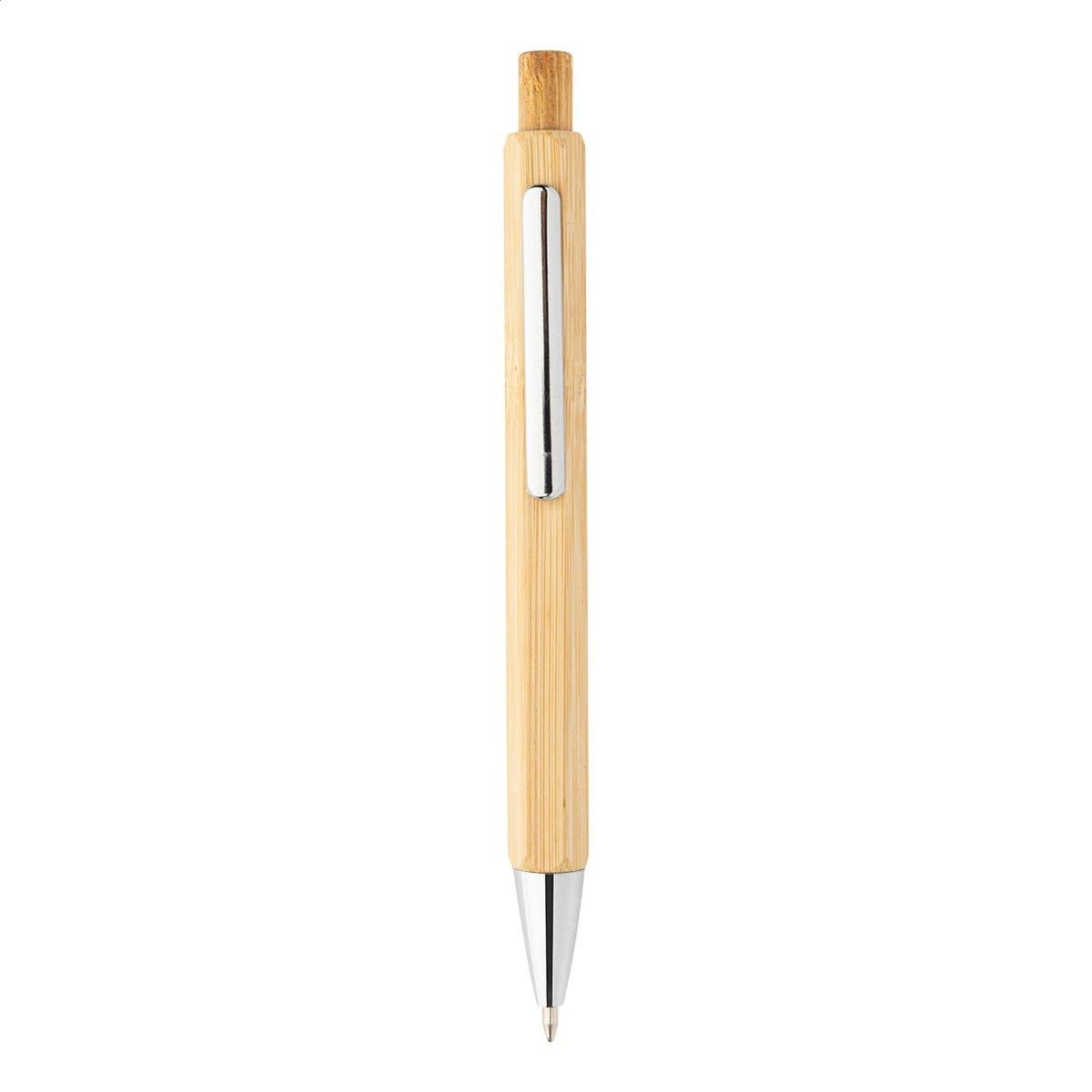 Šestihranné bambusové kuličkové pero s chromovanými částmi. S modrou náplní.