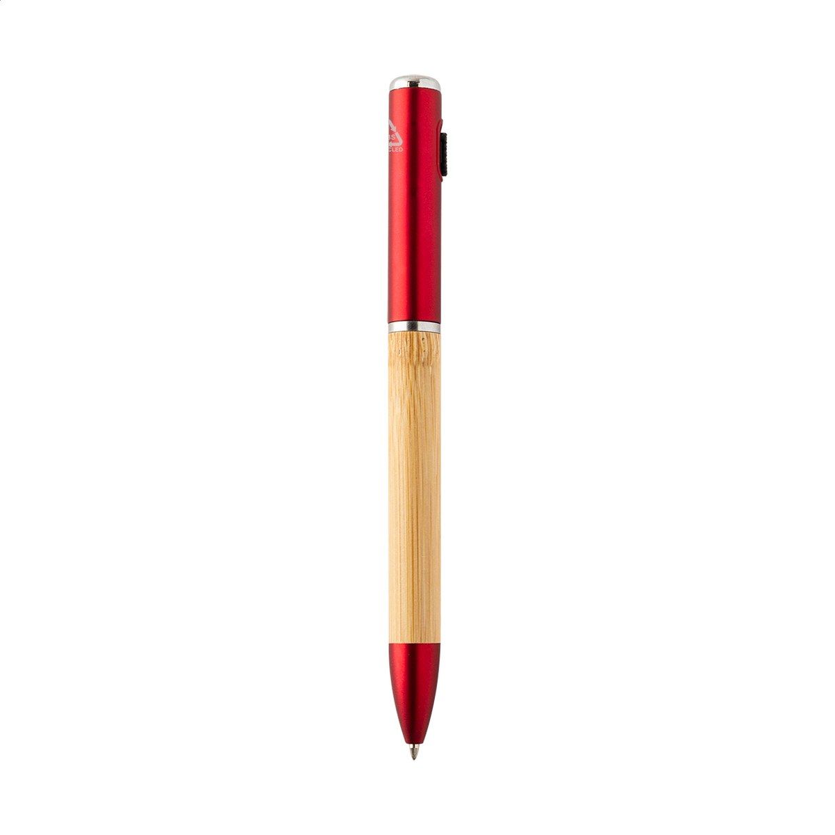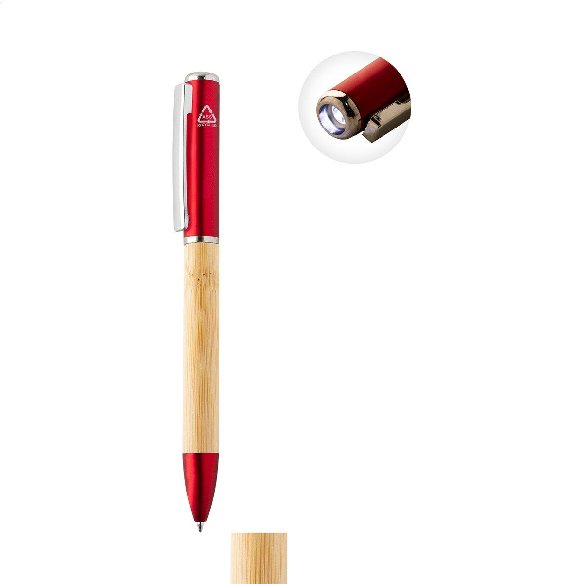 Kuličkové pero z bambusu a recyklovaného ABS plastu s 1 LED svítilnou. S modrou náplní a knoflíkovou baterií.