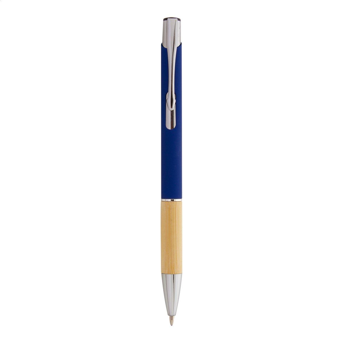 Hliníkové kuličkové pero s bambusovým úchopem, pogumovaným povrchem a modrou náplní. Se speciální vrstvou pro zrcadlové laserové gravírování.