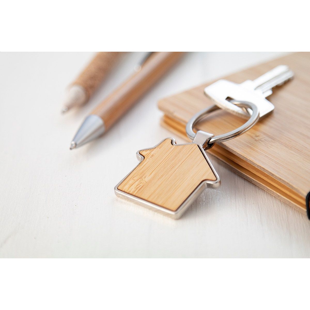 Kovový přívěsek na klíče ve tvaru domu s bambusovou vložkou. V kraftové papírové krabičce.