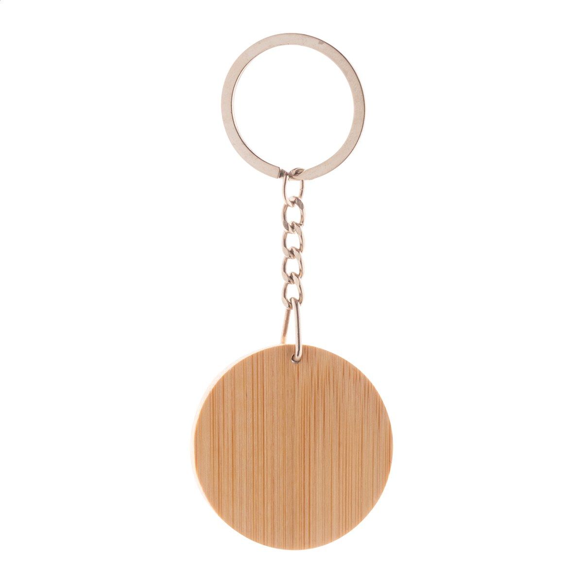 Bambusový přívěsek na klíče s pogumovanou nerezovou destičkou a kovovým kroužkem. Se speciální vrstvou pro zrcadlové laserové gravírování.