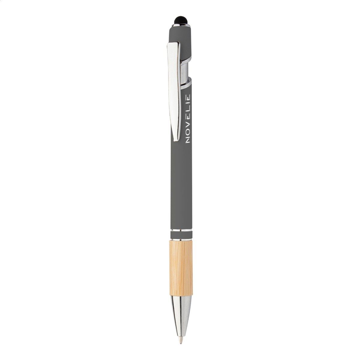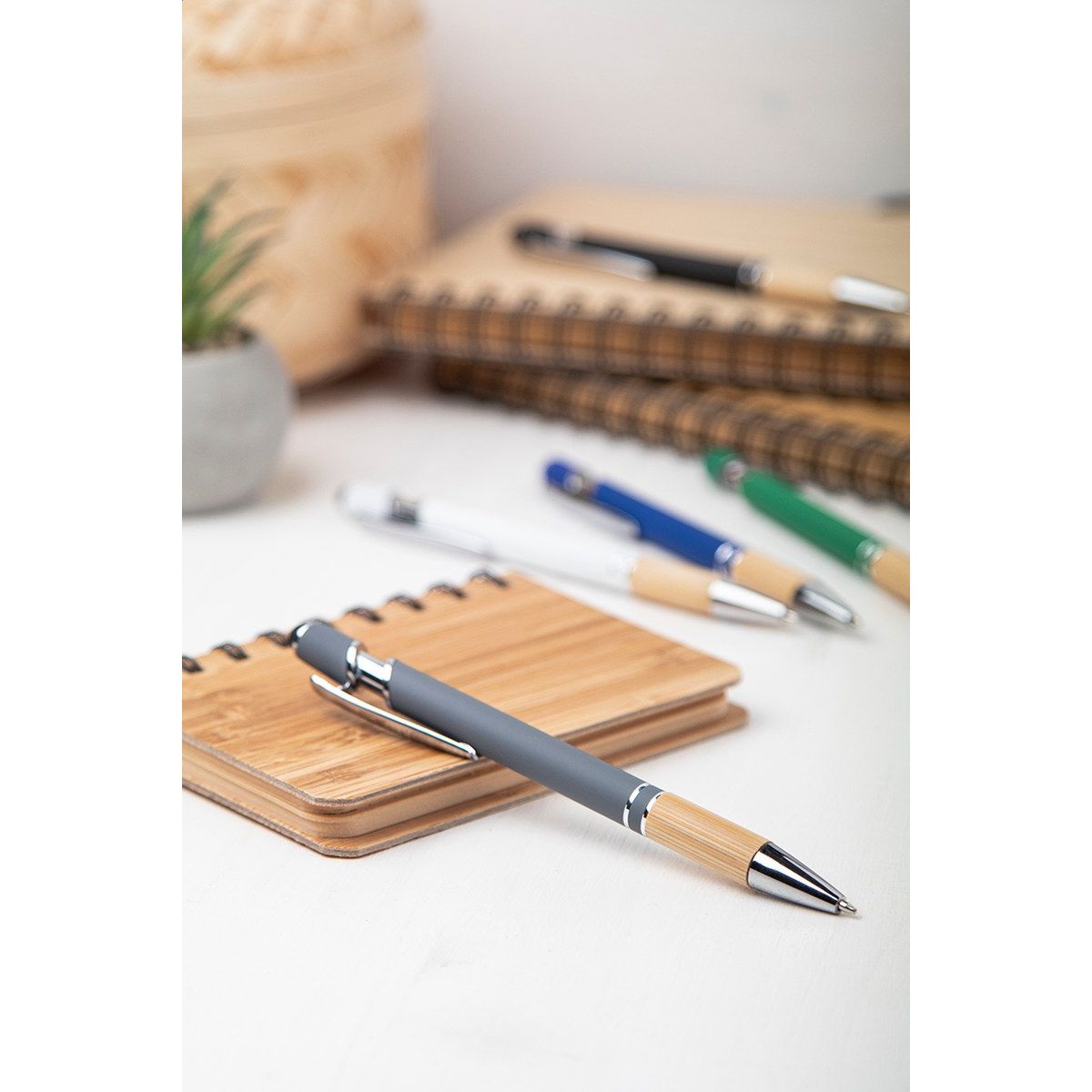 Hliníkové kuličkové a dotykové pero s bambusovým úchopem a pogumovaným povrchem. Se speciální vrstvou pro zrcadlové laserové gravírování. S modrou náplní.
