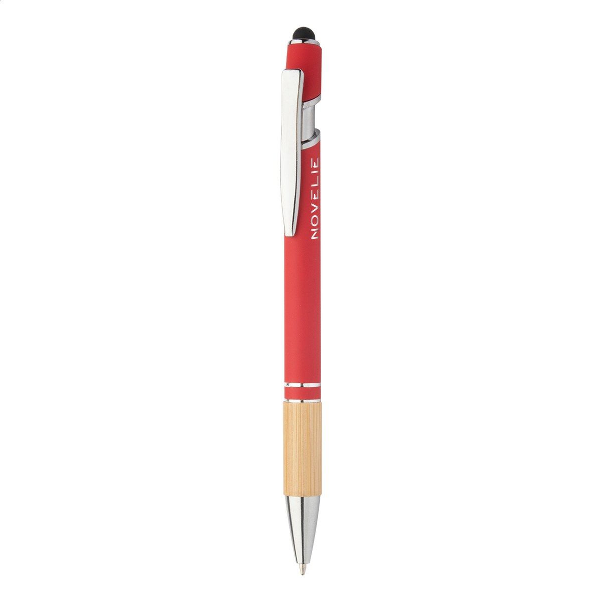 Hliníkové kuličkové a dotykové pero s bambusovým úchopem a pogumovaným povrchem. Se speciální vrstvou pro zrcadlové laserové gravírování. S modrou náplní.