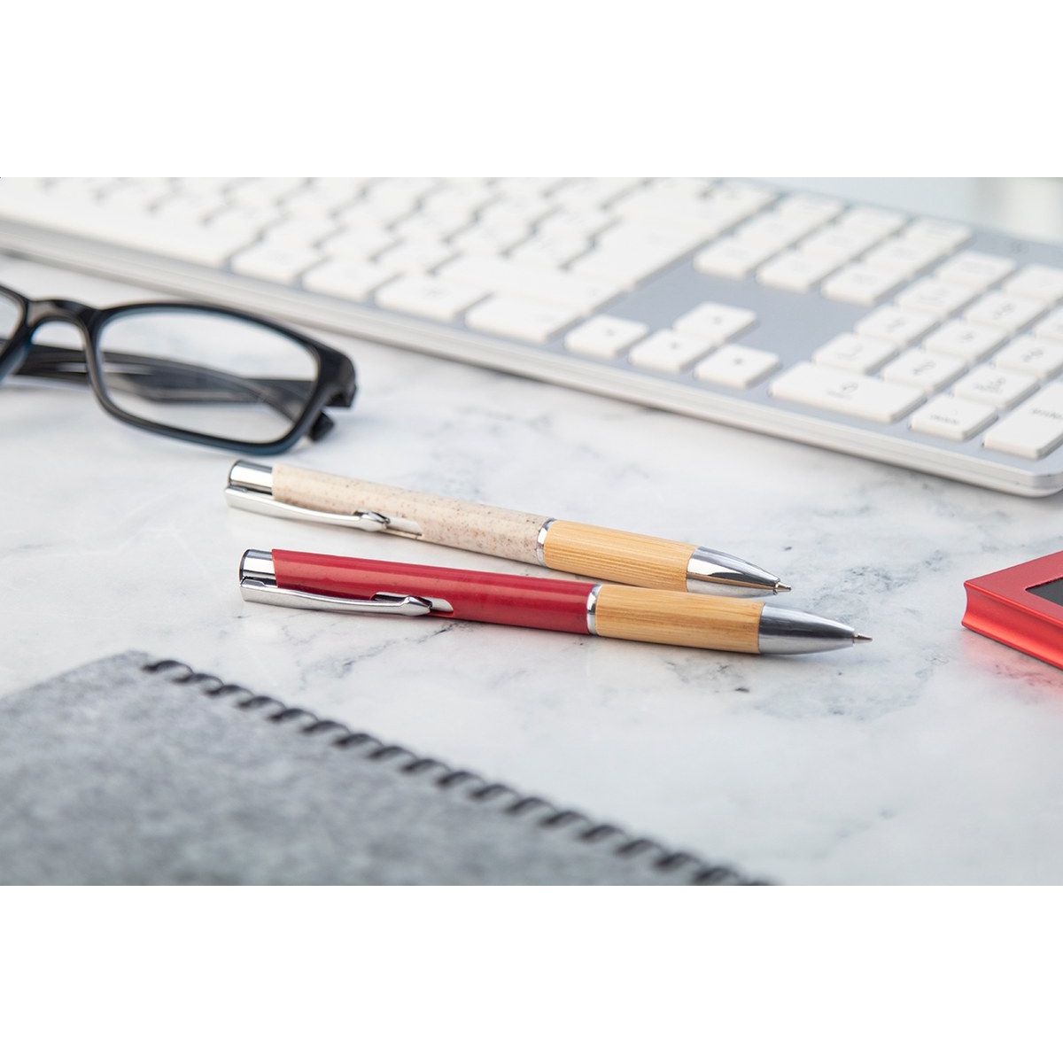 Ekologické plastové kuličkové pero z pšeničné slámy s bambusovým úchopem a kovovými částmi. S modrou náplní.