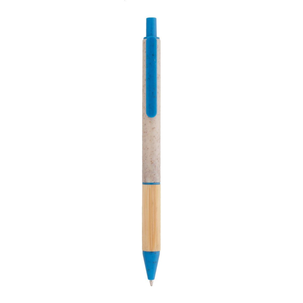Ekologické plastové kuličkové pero z pšeničné slámy s bambusovým úchopem a barevnými částmi. S modrou náplní.