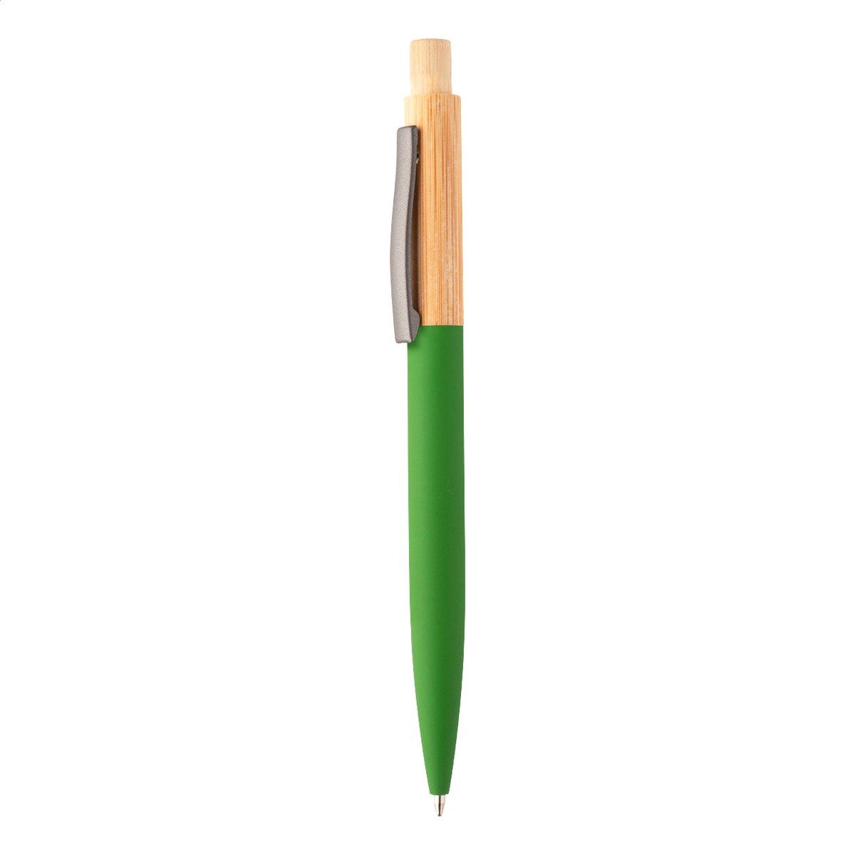 Kuličkové pero z bambusu a recyklovaného hliníku s pogumovaným povrchem a kovovým klipem. S modrou náplní.