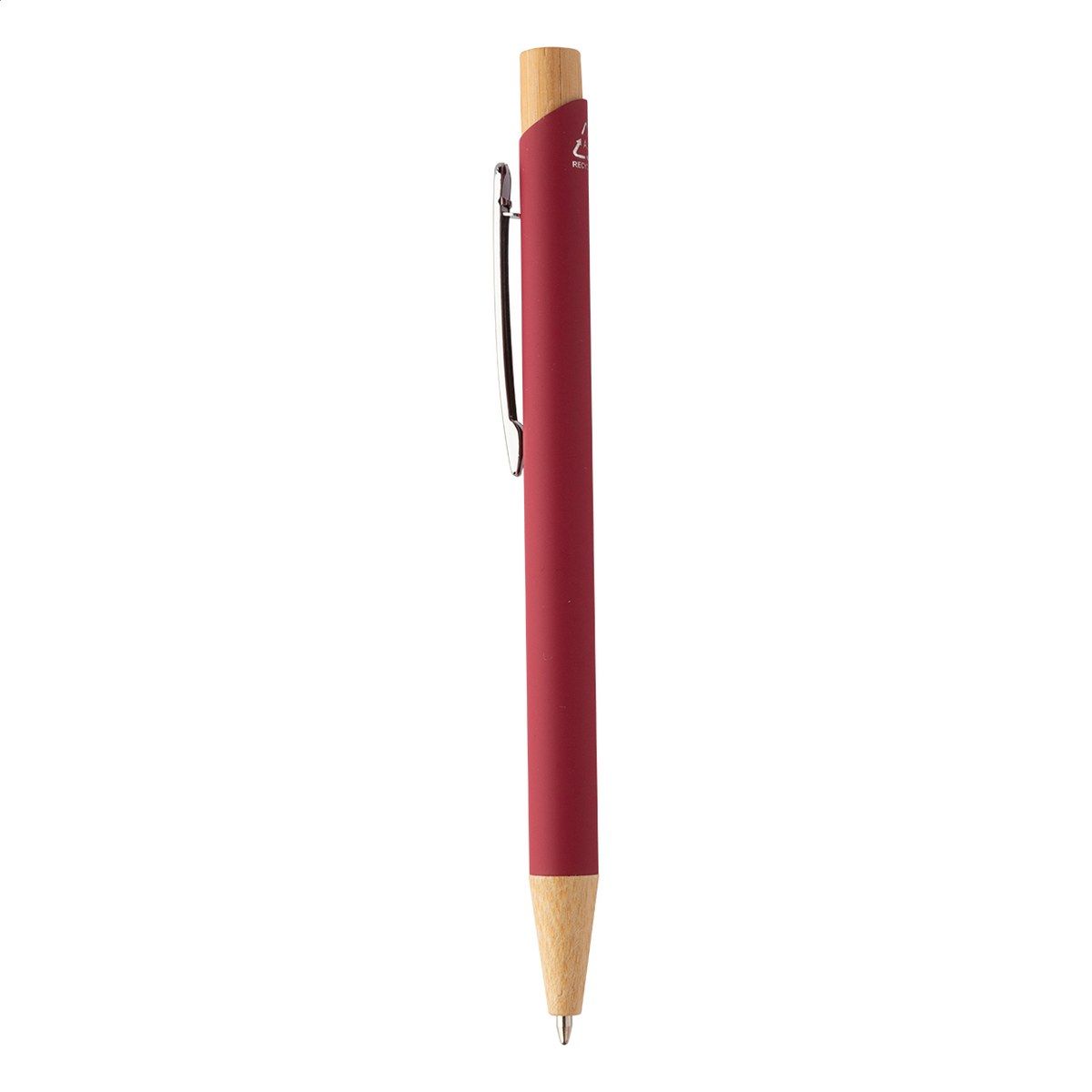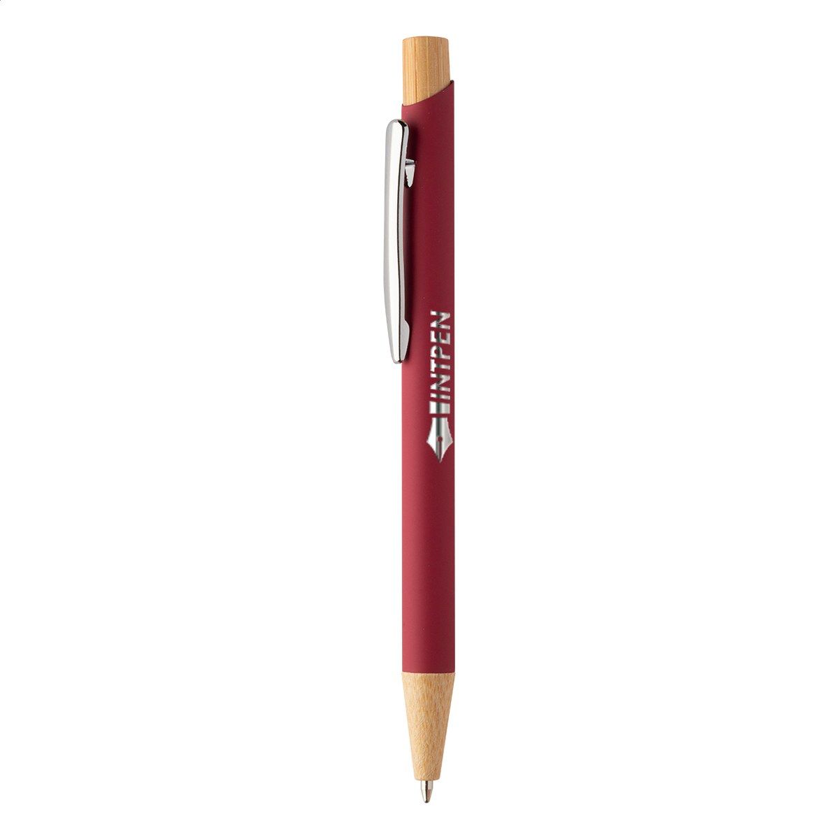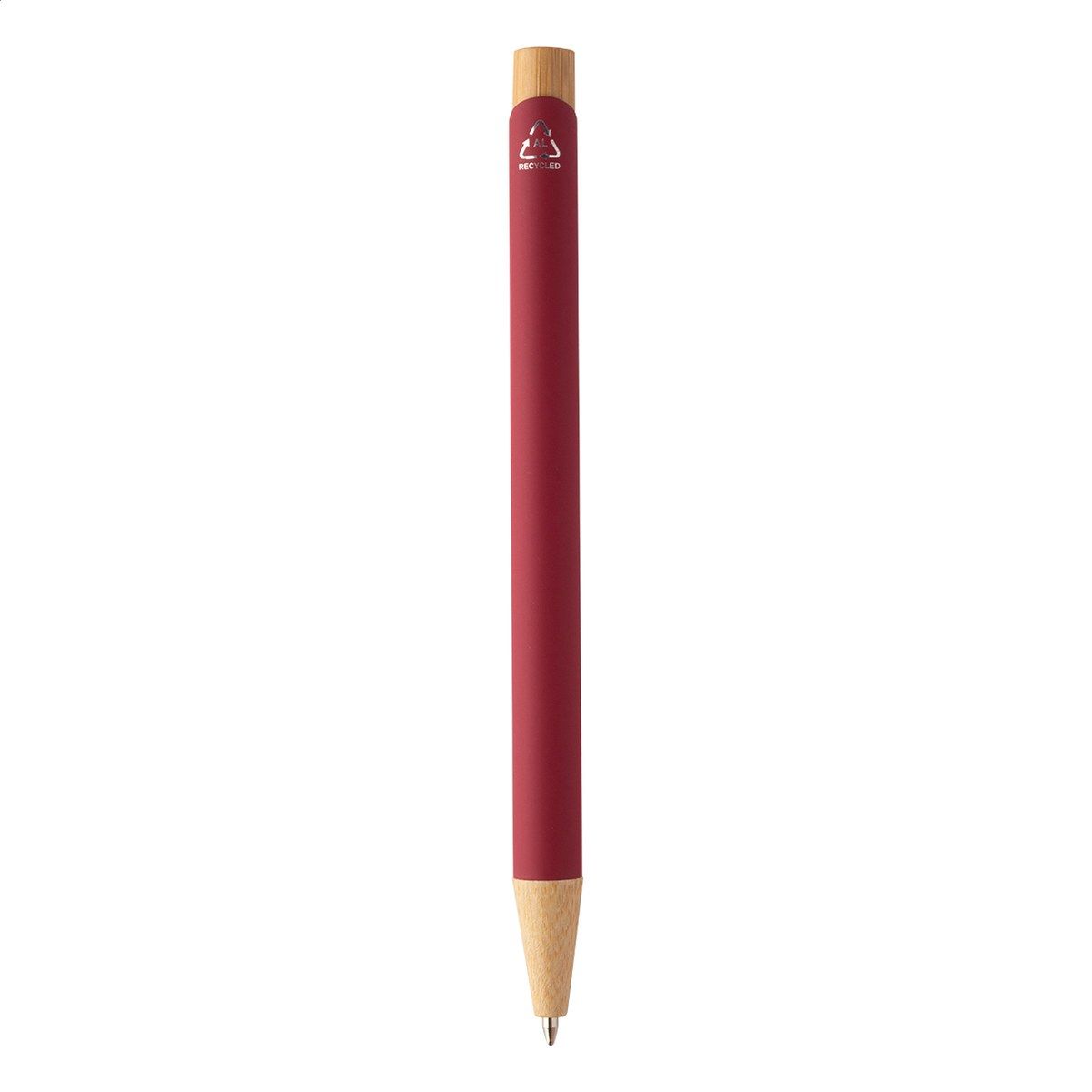 Kuličkové pero z recyklovaného hliníku s bambusovými částmi, pogumovaným povrchem a chromovým klipem. Se speciální vrstvou pro zrcadlové laserové gravírování. S modrou náplní.