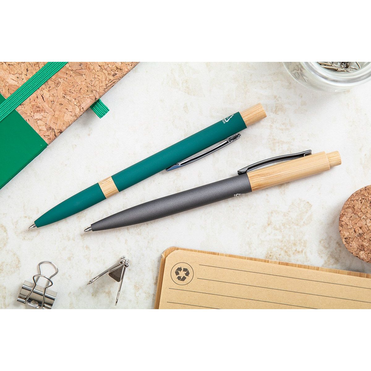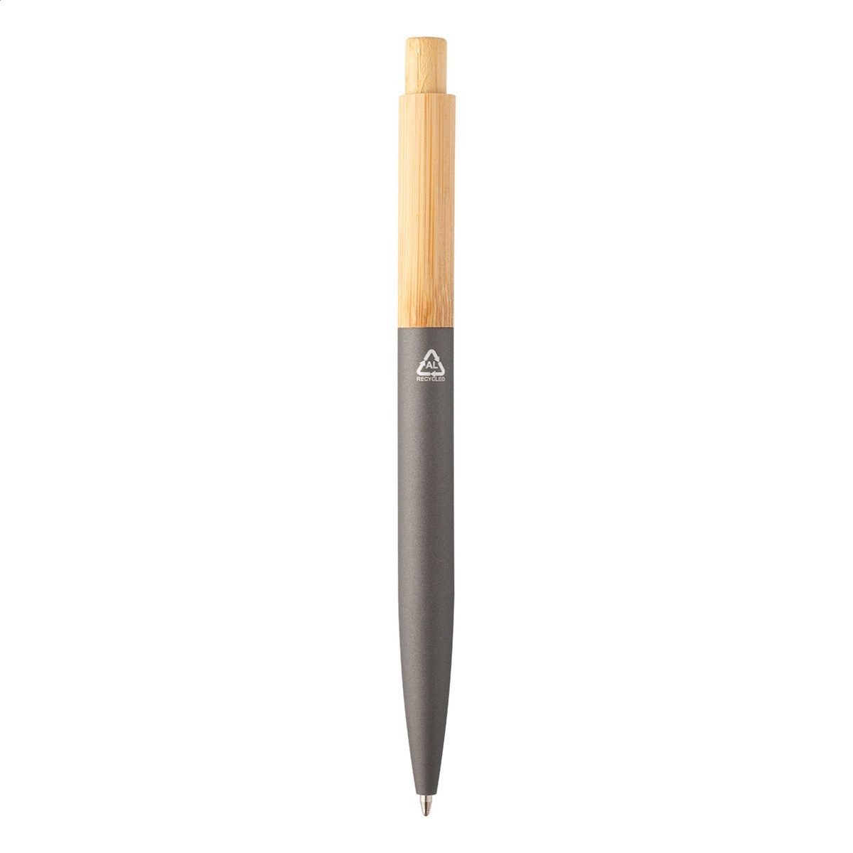 Kuličkové pero z bambusu a recyklovaného hliníku s pogumovaným povrchem a kovovým klipem. S modrou náplní.