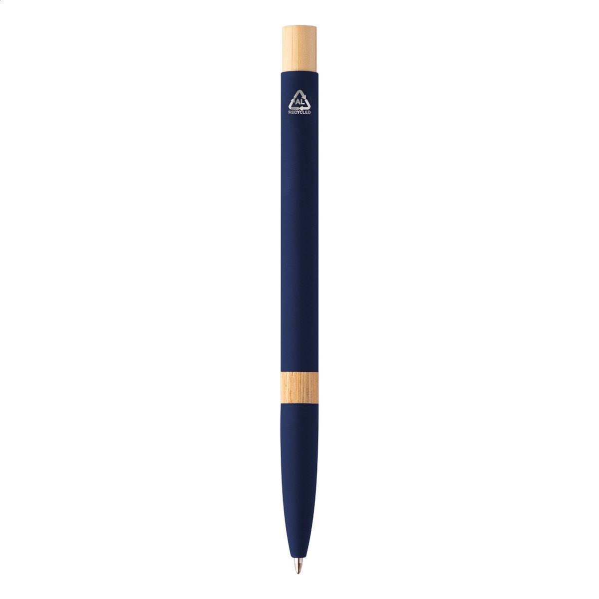 Kuličkové pero z recyklovaného hliníku s bambusovými částmi, pogumovaným povrchem a chromovým klipem. Se speciální vrstvou pro zrcadlové laserové gravírování. S modrou náplní.