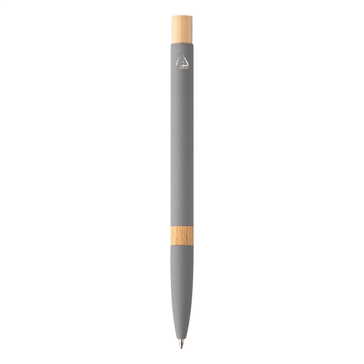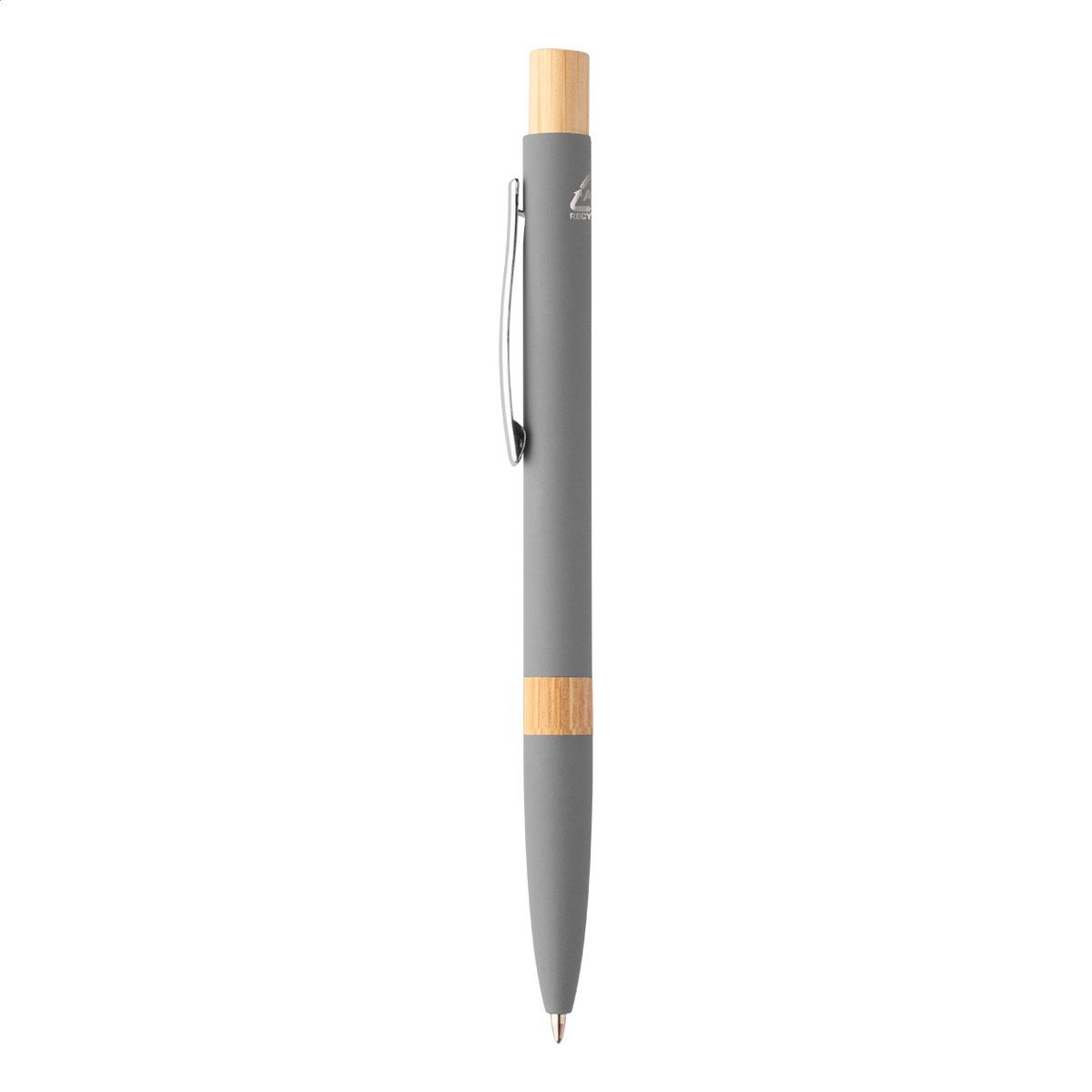 Kuličkové pero z recyklovaného hliníku s bambusovými částmi, pogumovaným povrchem a chromovým klipem. Se speciální vrstvou pro zrcadlové laserové gravírování. S modrou náplní.