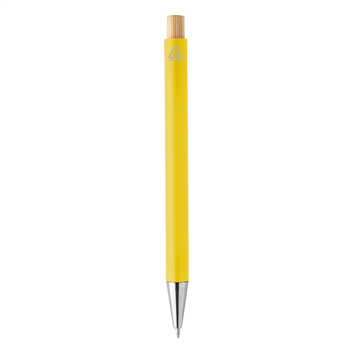 Kuličkové pero z recyklovaného ABS plastu s bambusovým tlačítkem a kovovým klipem. S modrou náplní.