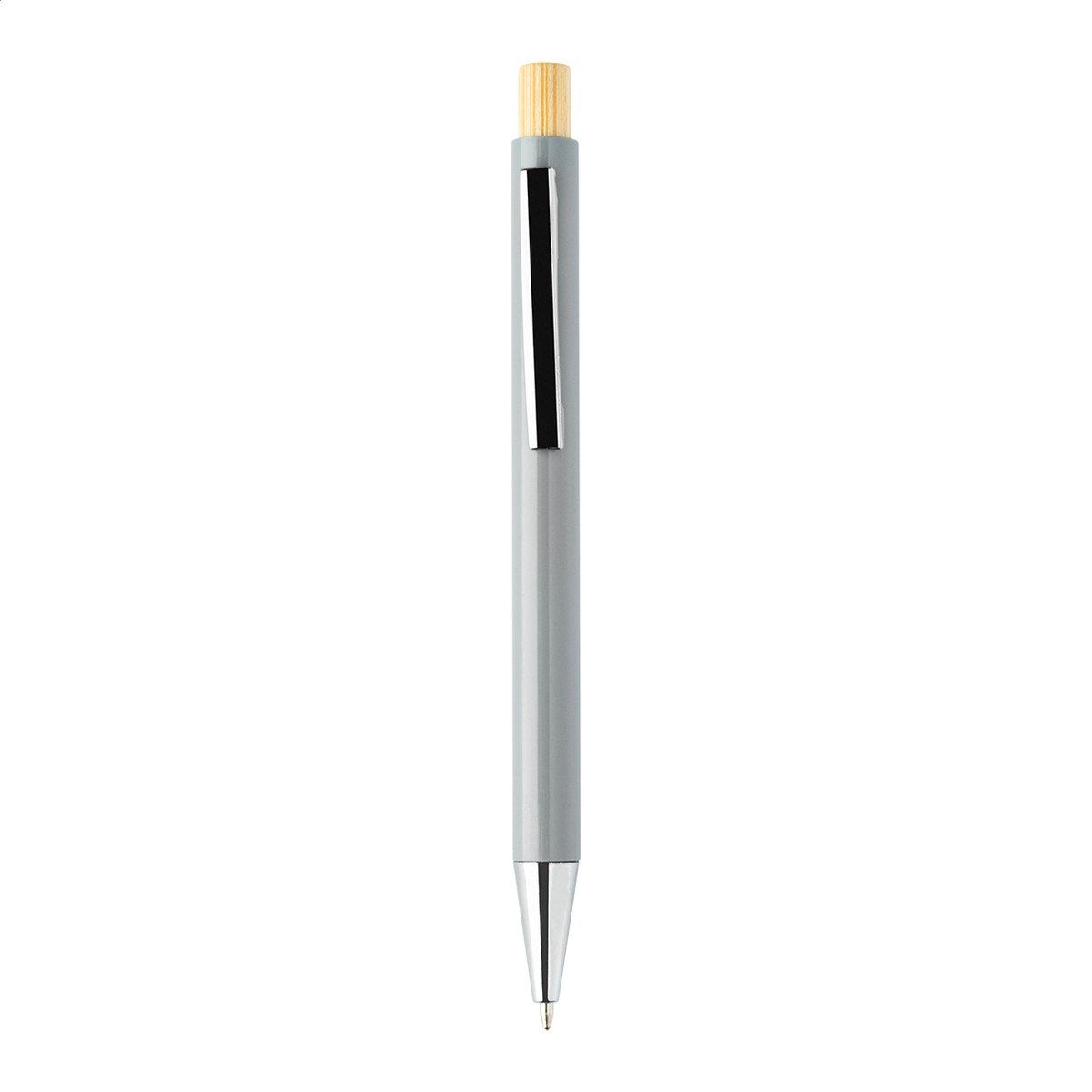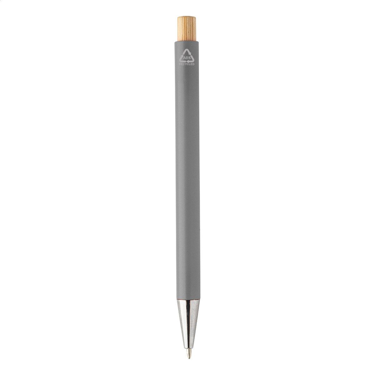 Kuličkové pero z recyklovaného ABS plastu s bambusovým tlačítkem a kovovým klipem. S modrou náplní.