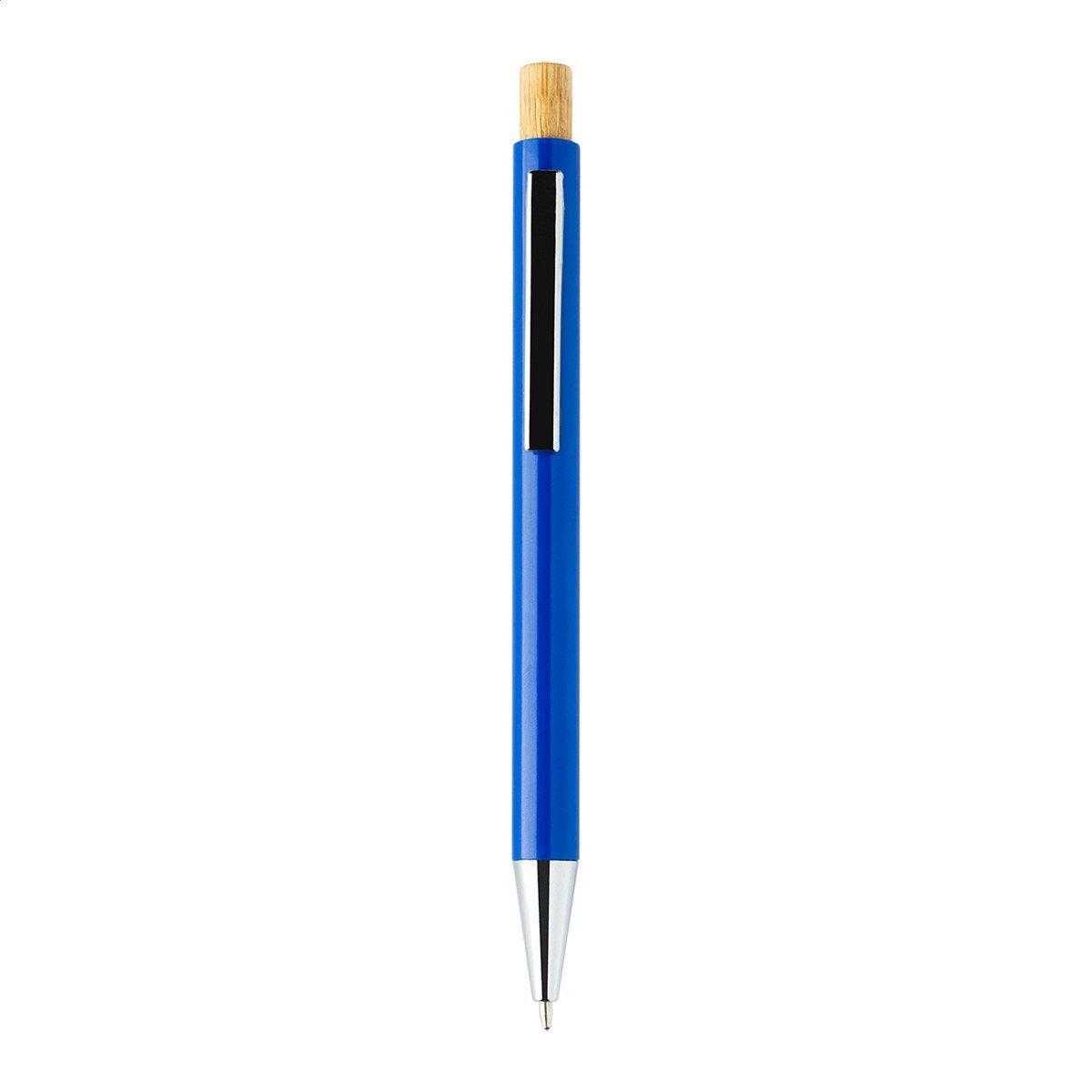 Kuličkové pero z recyklovaného ABS plastu s bambusovým tlačítkem a kovovým klipem. S modrou náplní.