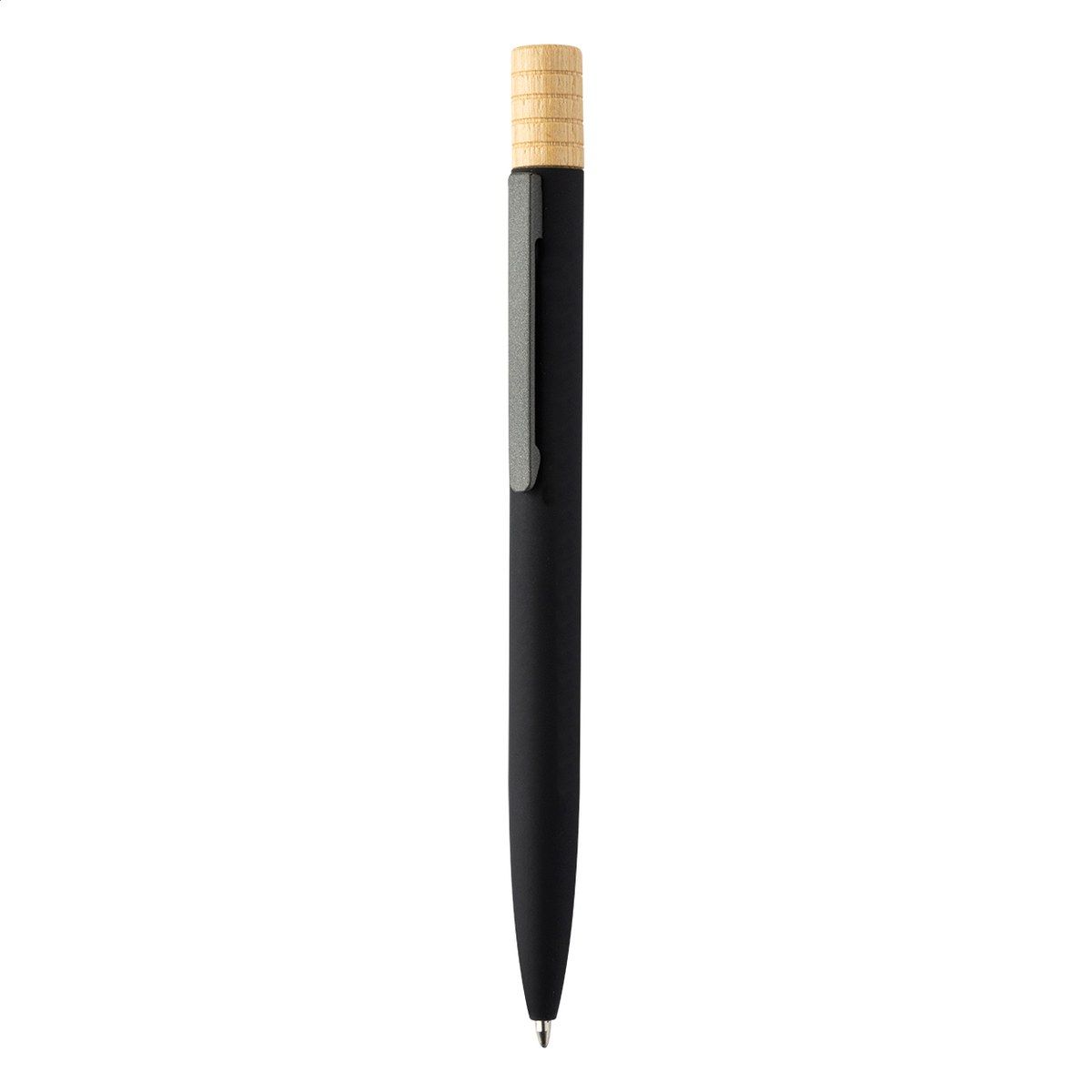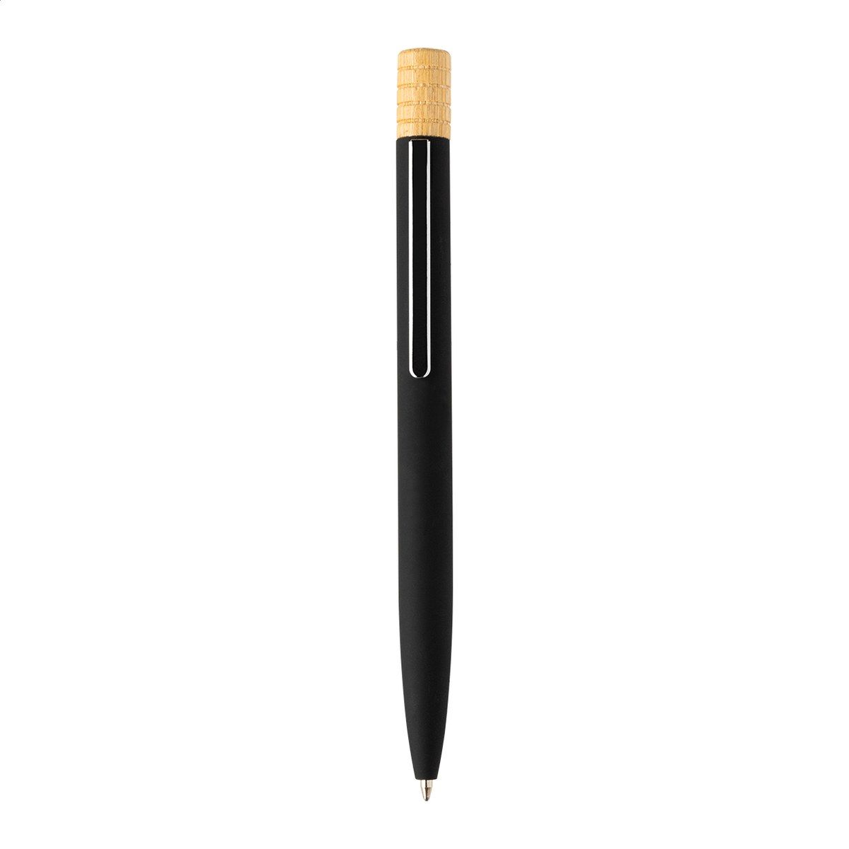 Kuličkové pero z recyklovaného hliníku s kovovým klipem a bambusovým vrškem. S modrou náplní. V kraftové papírové krabičce.