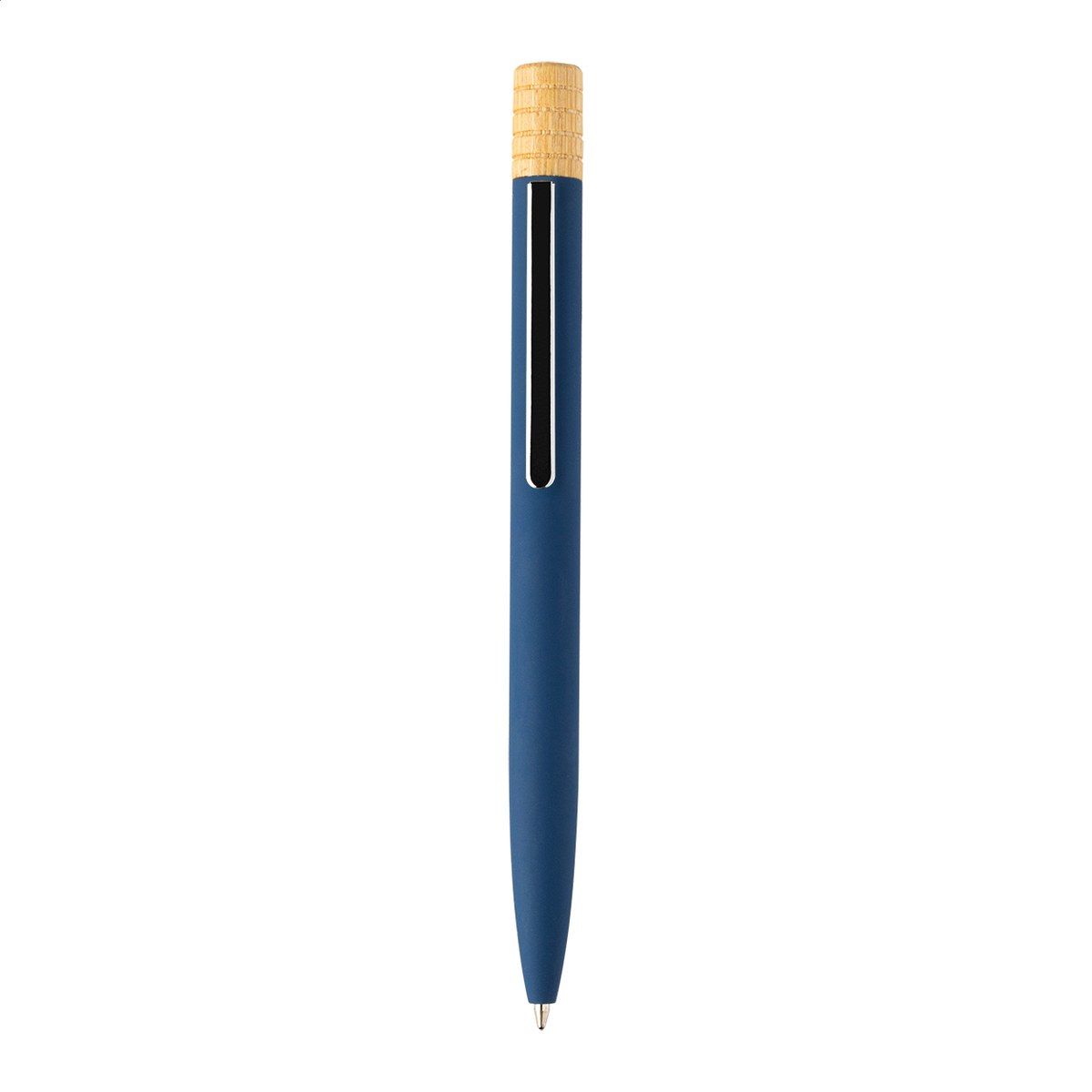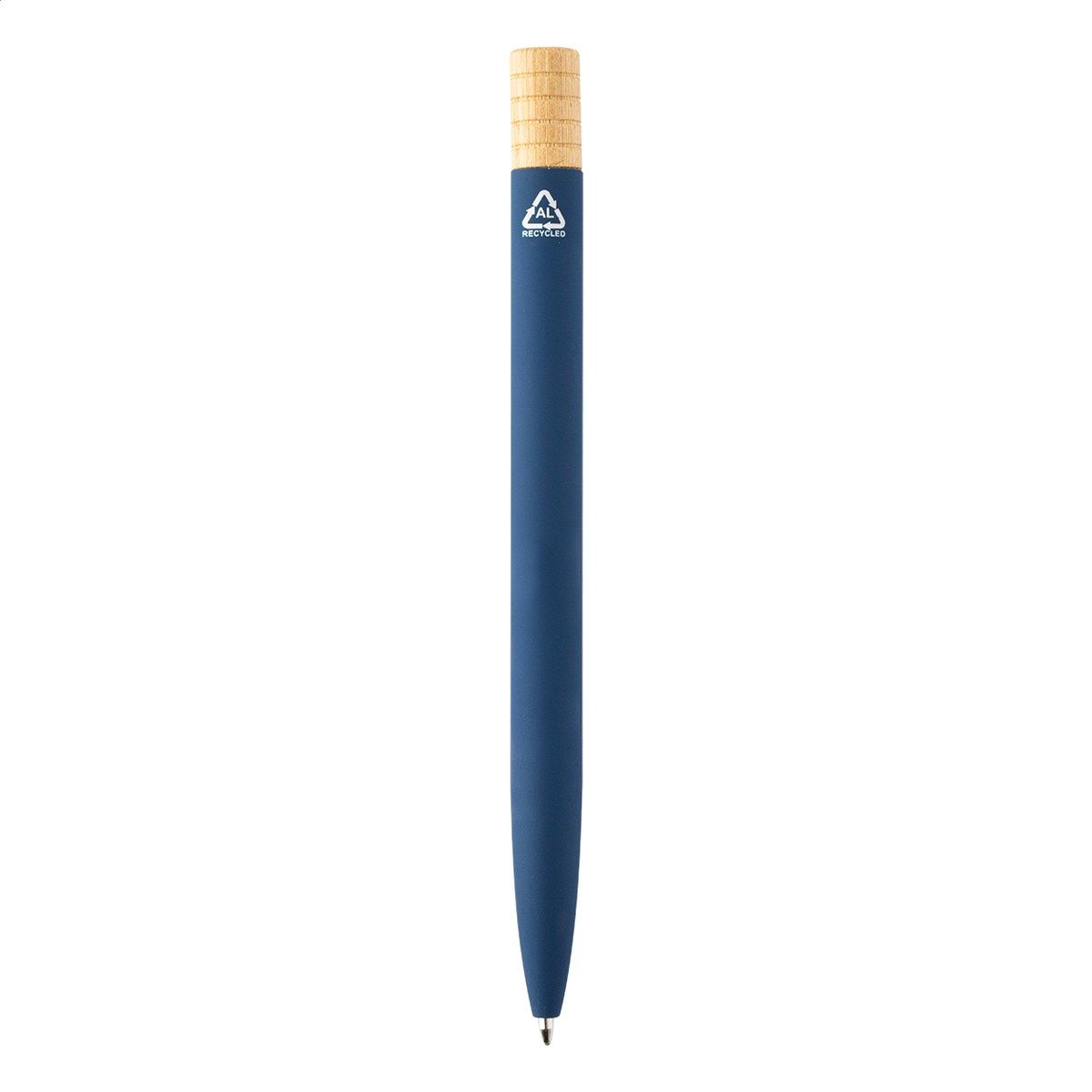 Kuličkové pero z recyklovaného hliníku s kovovým klipem a bambusovým vrškem. S modrou náplní. V kraftové papírové krabičce.