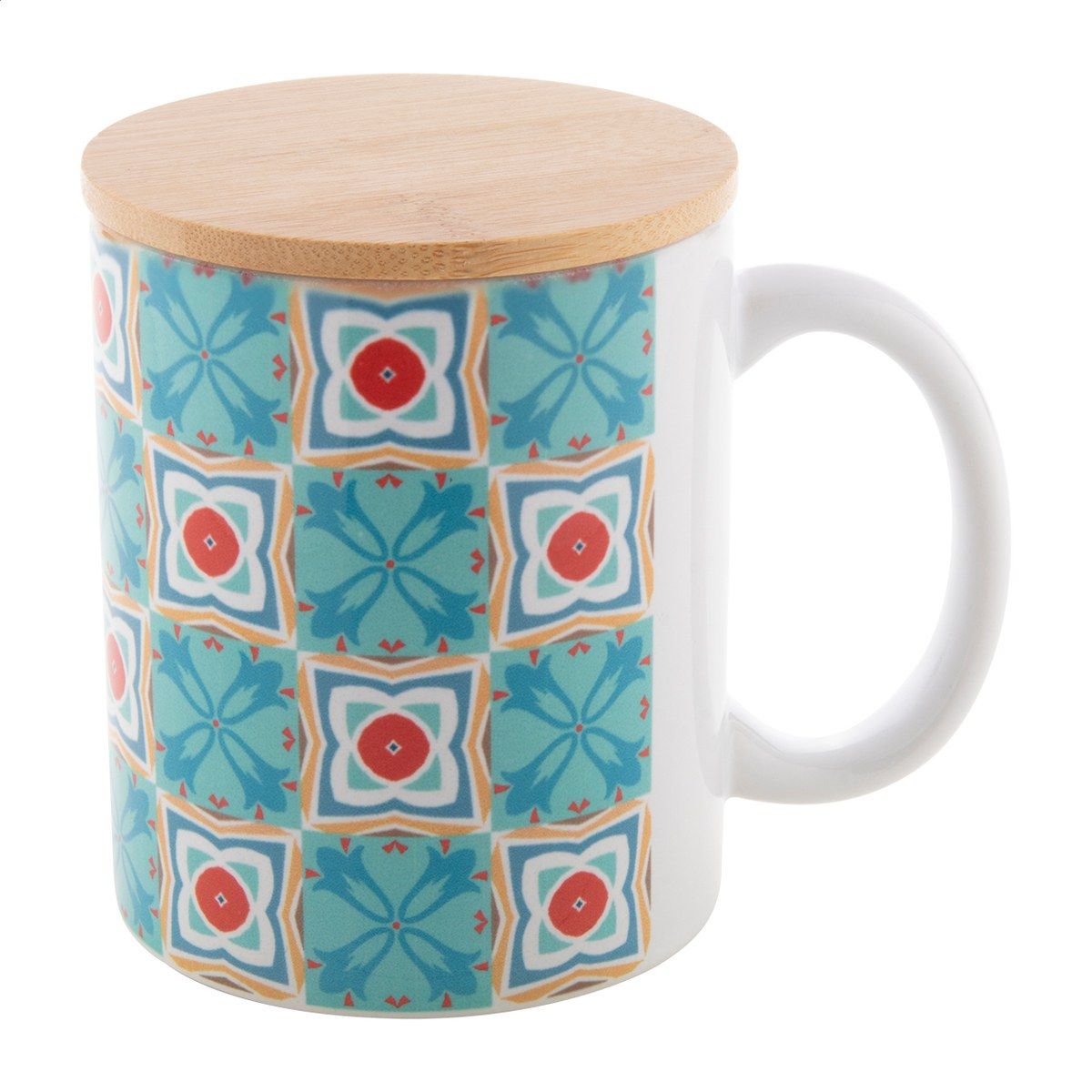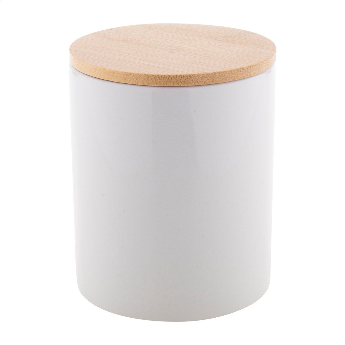 Bílý keramický hrnek s bambusovým víčkem pro sublimační potisk vhodný do myčky na nádobí, 300 ml. V kraftové papírové krabici.