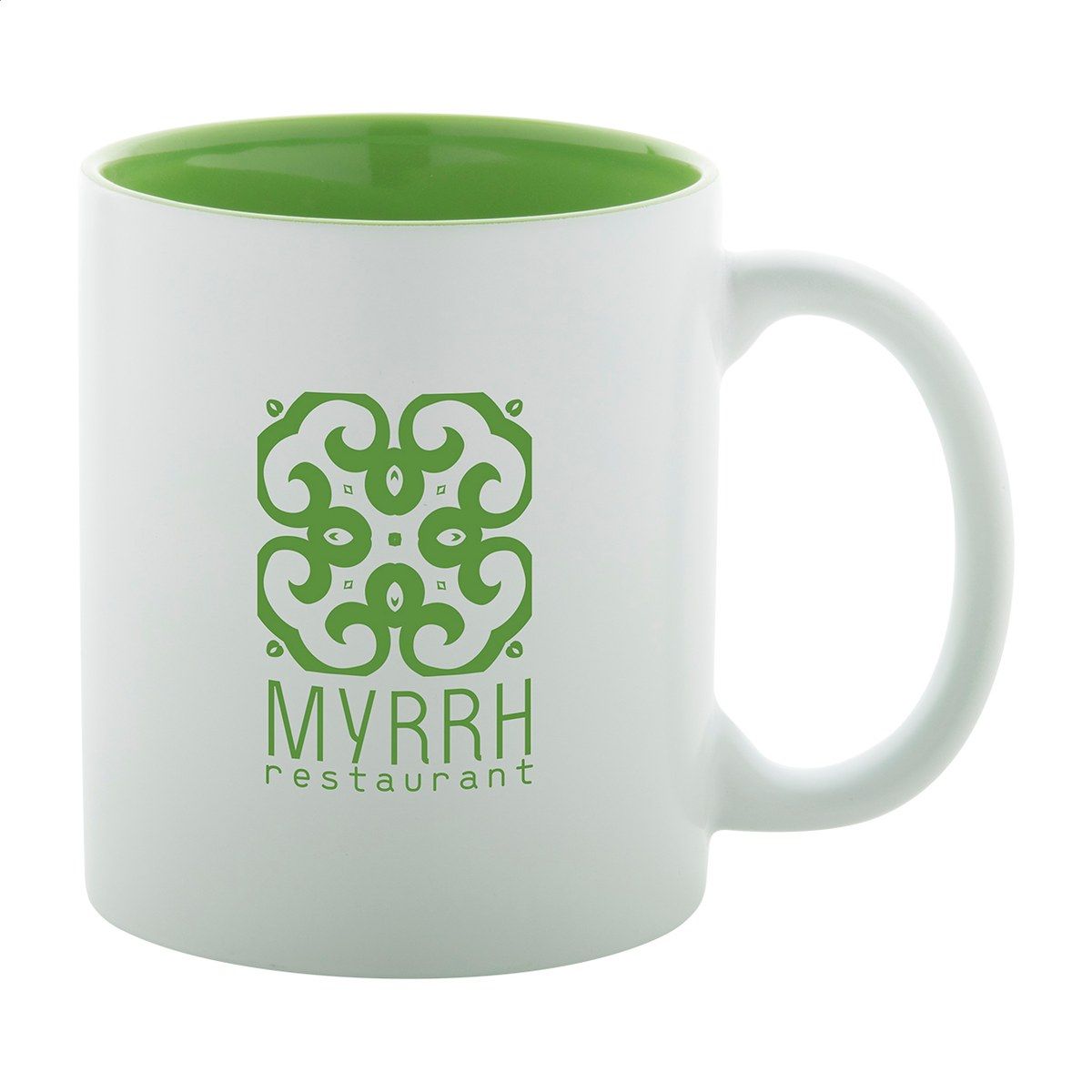 Witte keramiek mok met gekleurde binnenkant, de gegraveerd kleur is hetzelfde als de kleur van de binnenkant. In geschenkverpakking. Inhoud: 350 ml.