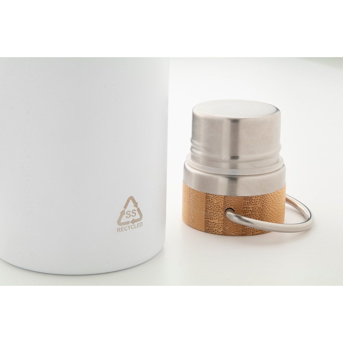 Dvoustěnná nerezová termoska z recyklované nerezové oceli s bambusovým víkem, 500 ml.