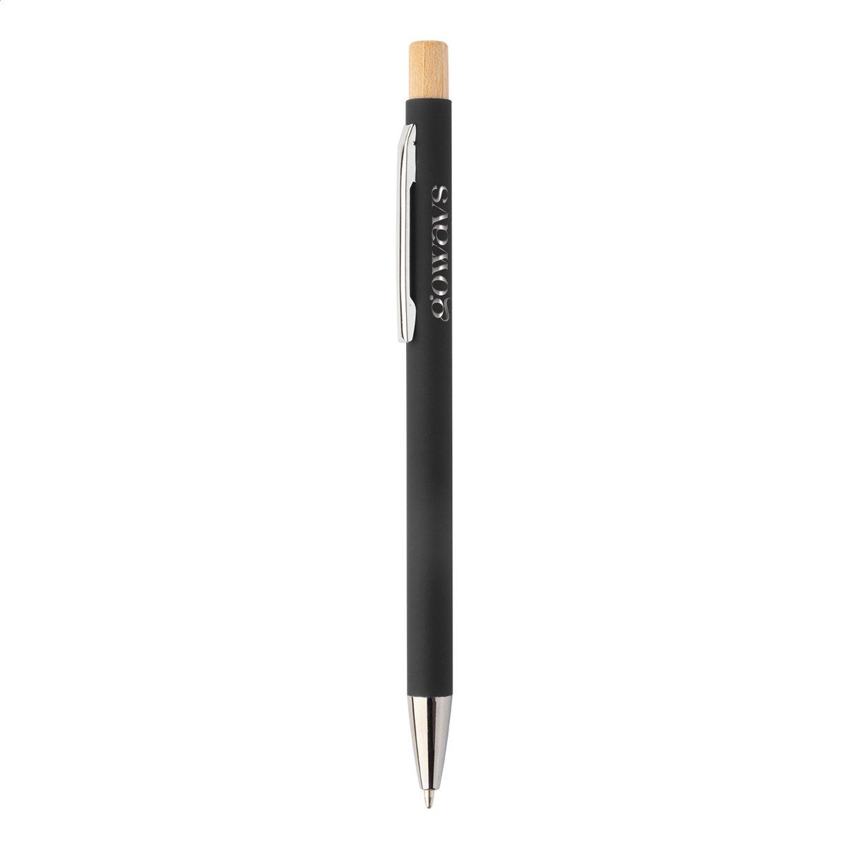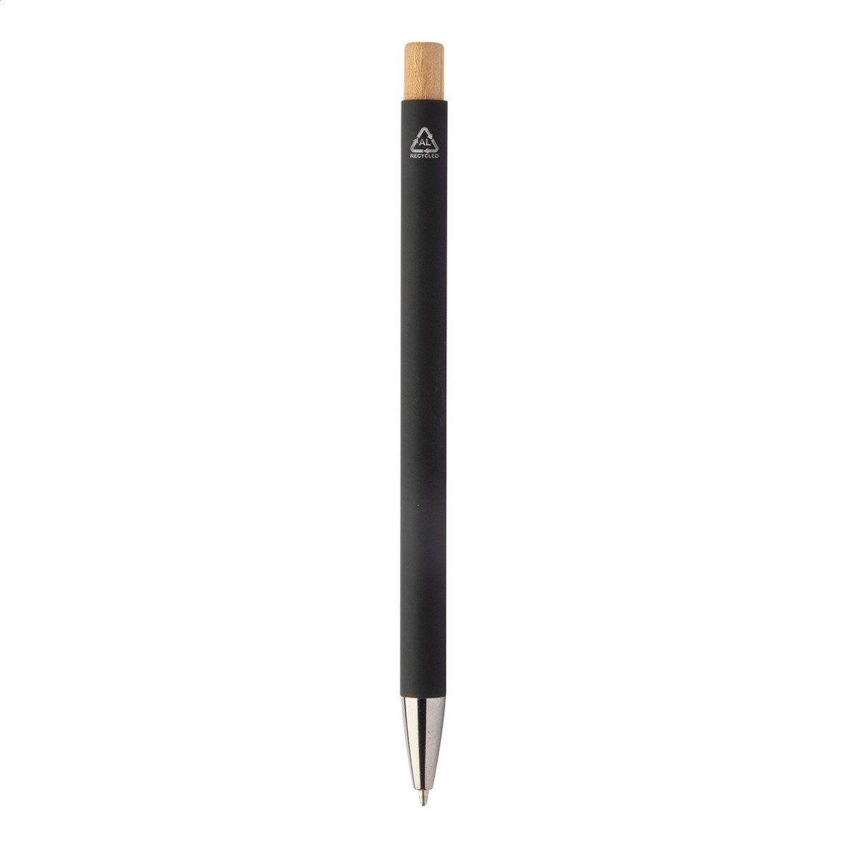 Kuličkové pero z recyklovaného hliníku s pogumovaným povrchem a bambusovým tlačítkem a chromovými detaily. Se speciální vrstvou pro zrcadlové laserové gravírování. S modrou náplní.