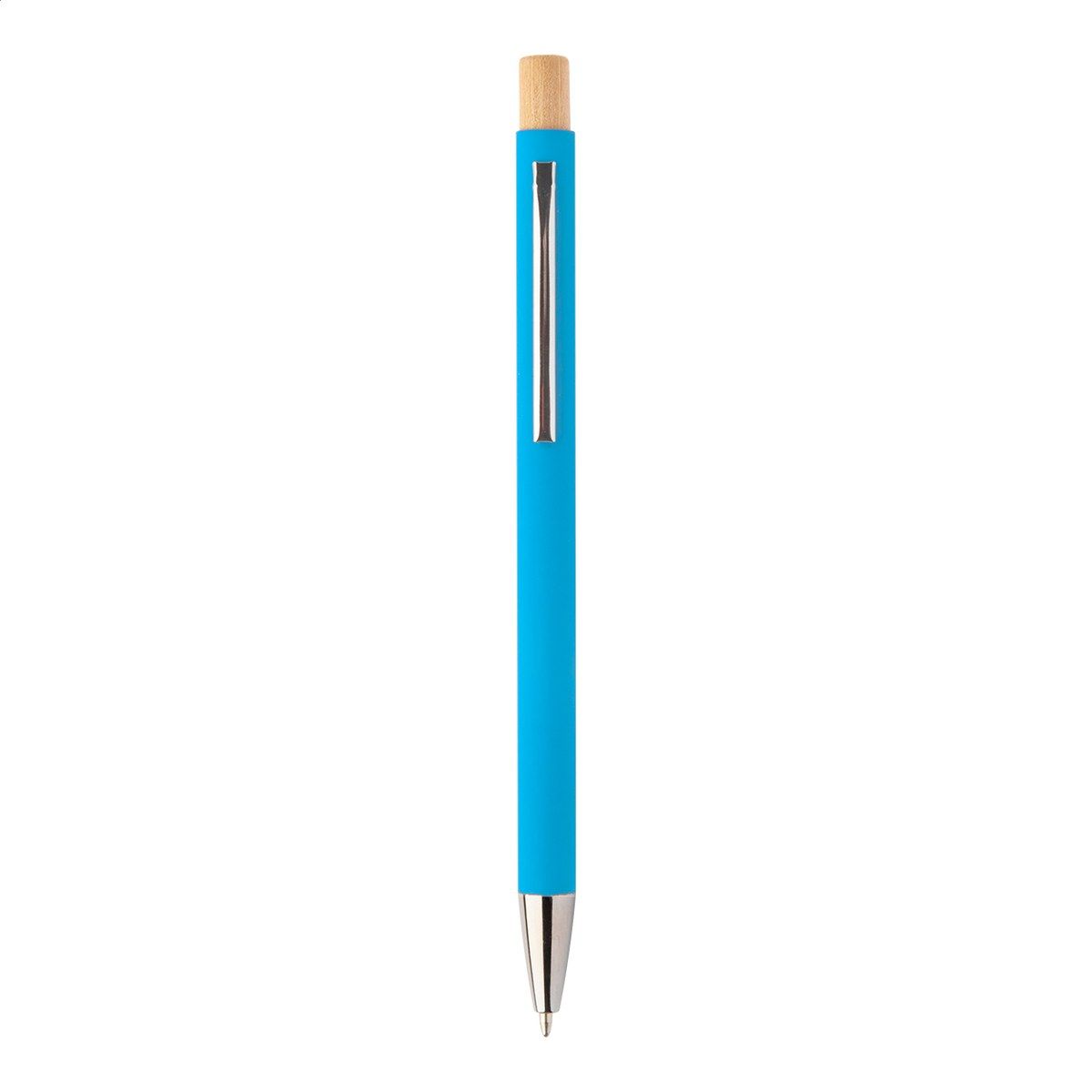 Kuličkové pero z recyklovaného hliníku s pogumovaným povrchem a bambusovým tlačítkem a chromovými detaily. Se speciální vrstvou pro zrcadlové laserové gravírování. S modrou náplní.