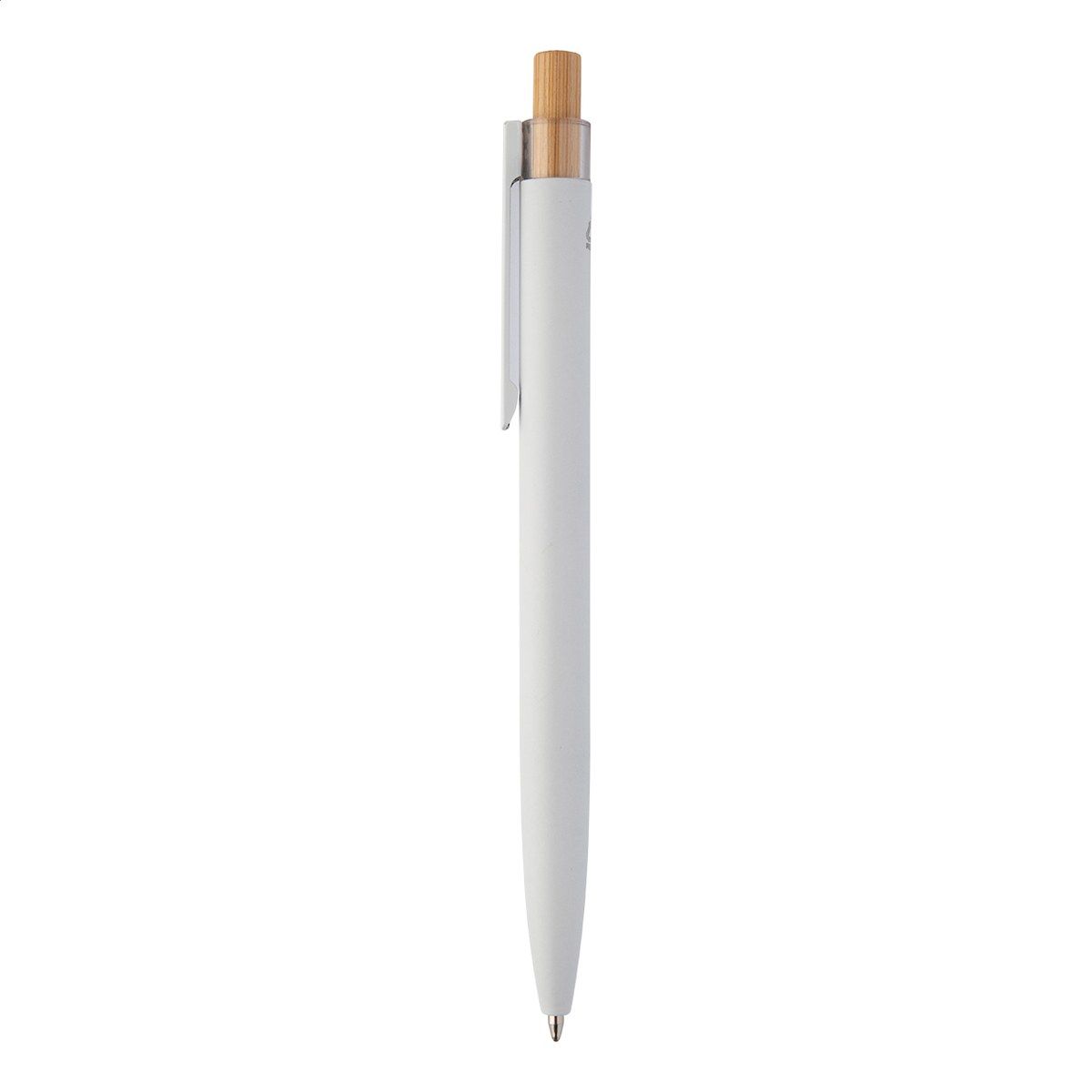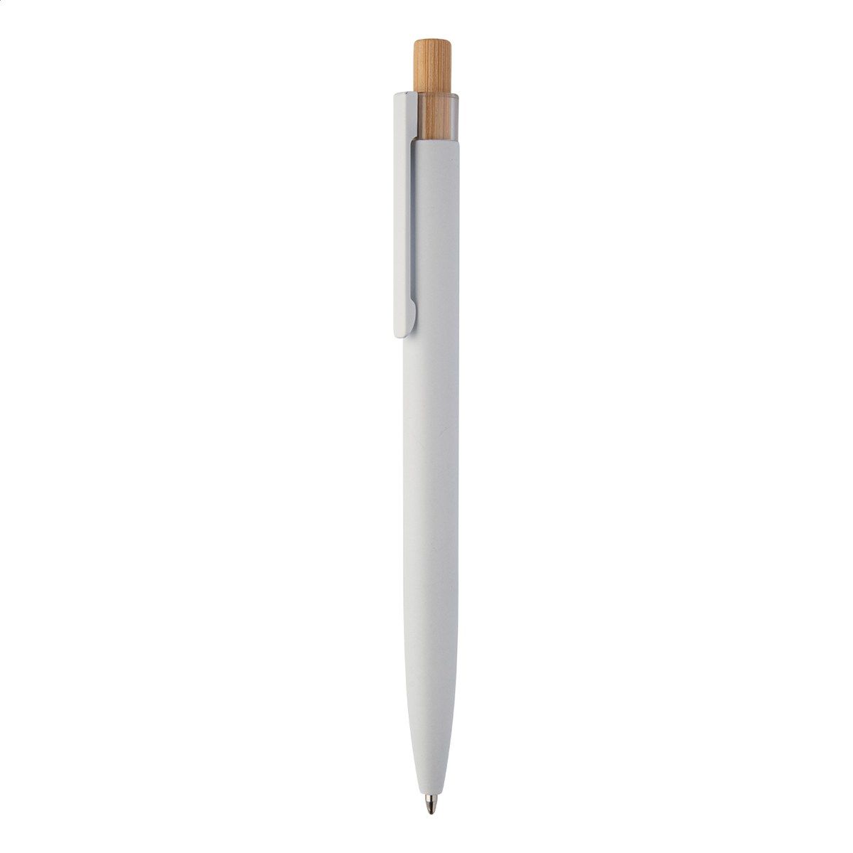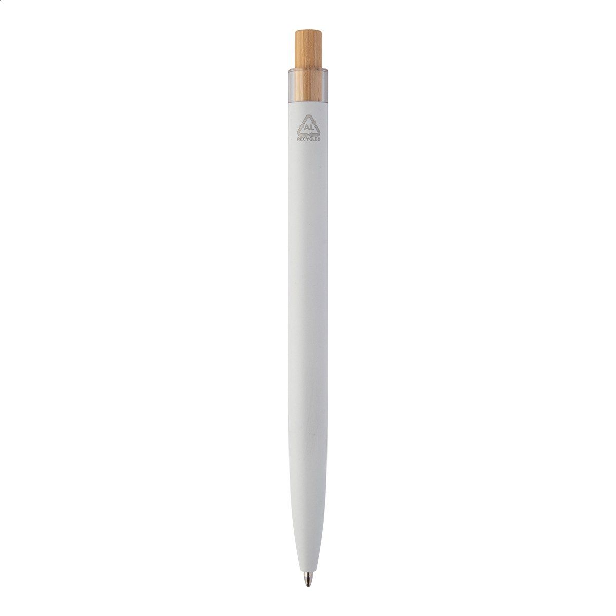 Kuličkové pero z recyklovaného hliníku s bambusovým tlačítkem. S modrou náplní.