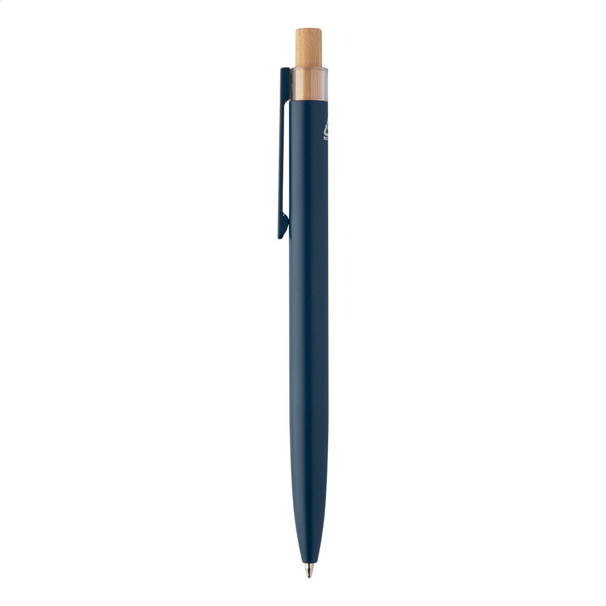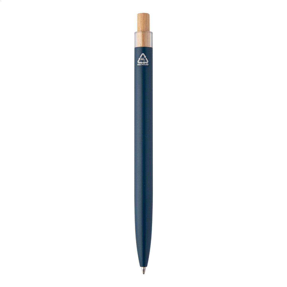 Kuličkové pero z recyklovaného hliníku s bambusovým tlačítkem. S modrou náplní.