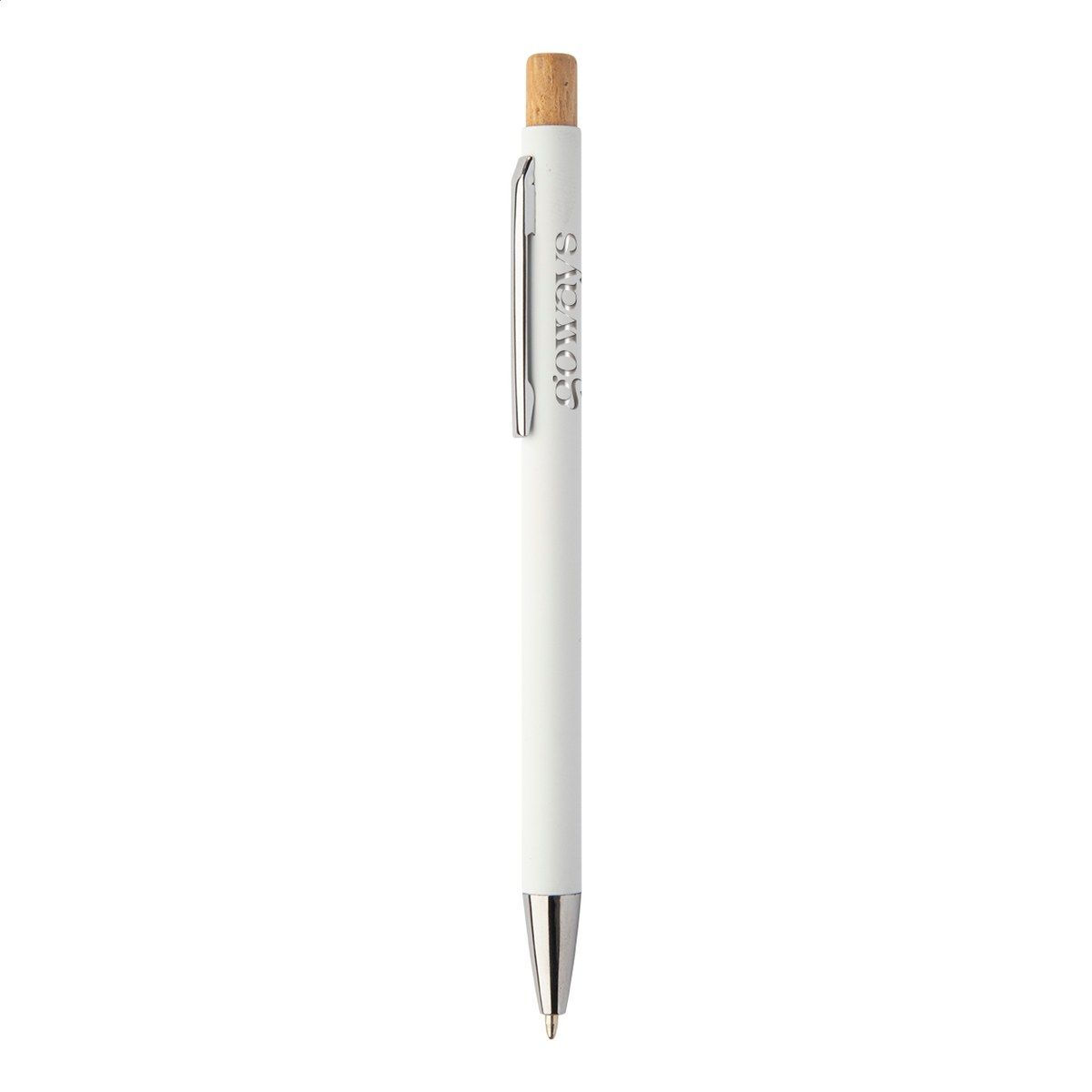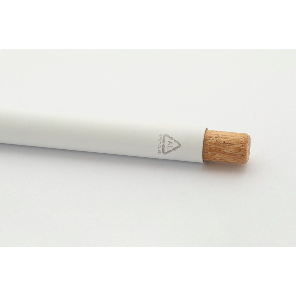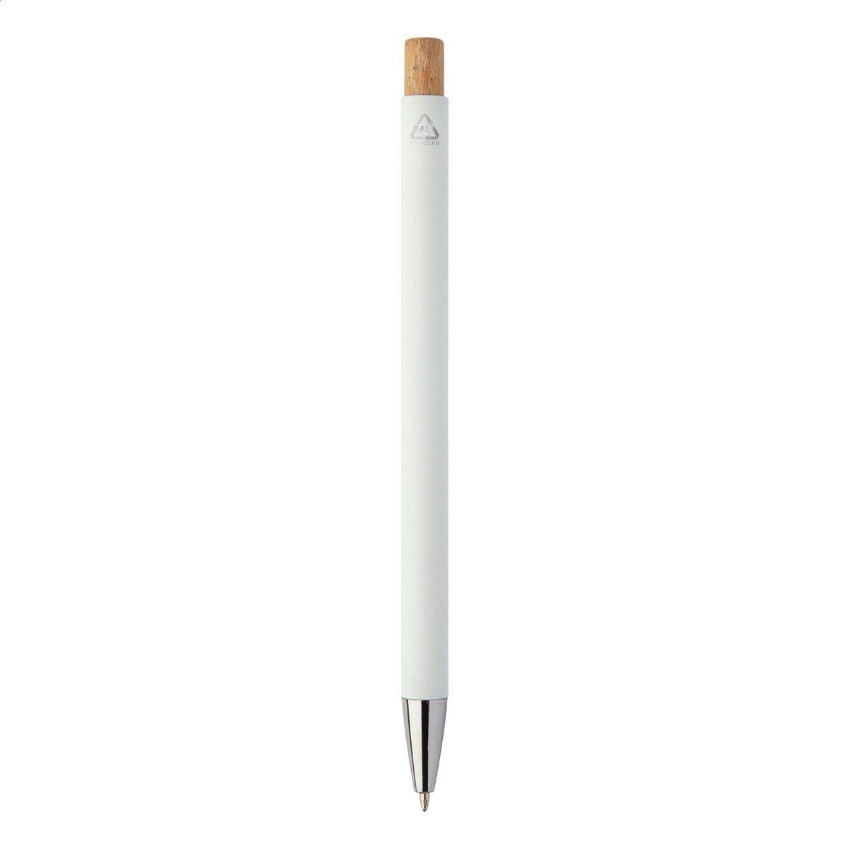 Kuličkové pero z recyklovaného hliníku s pogumovaným povrchem a bambusovým tlačítkem a chromovými detaily. Se speciální vrstvou pro zrcadlové laserové gravírování. S modrou náplní.
