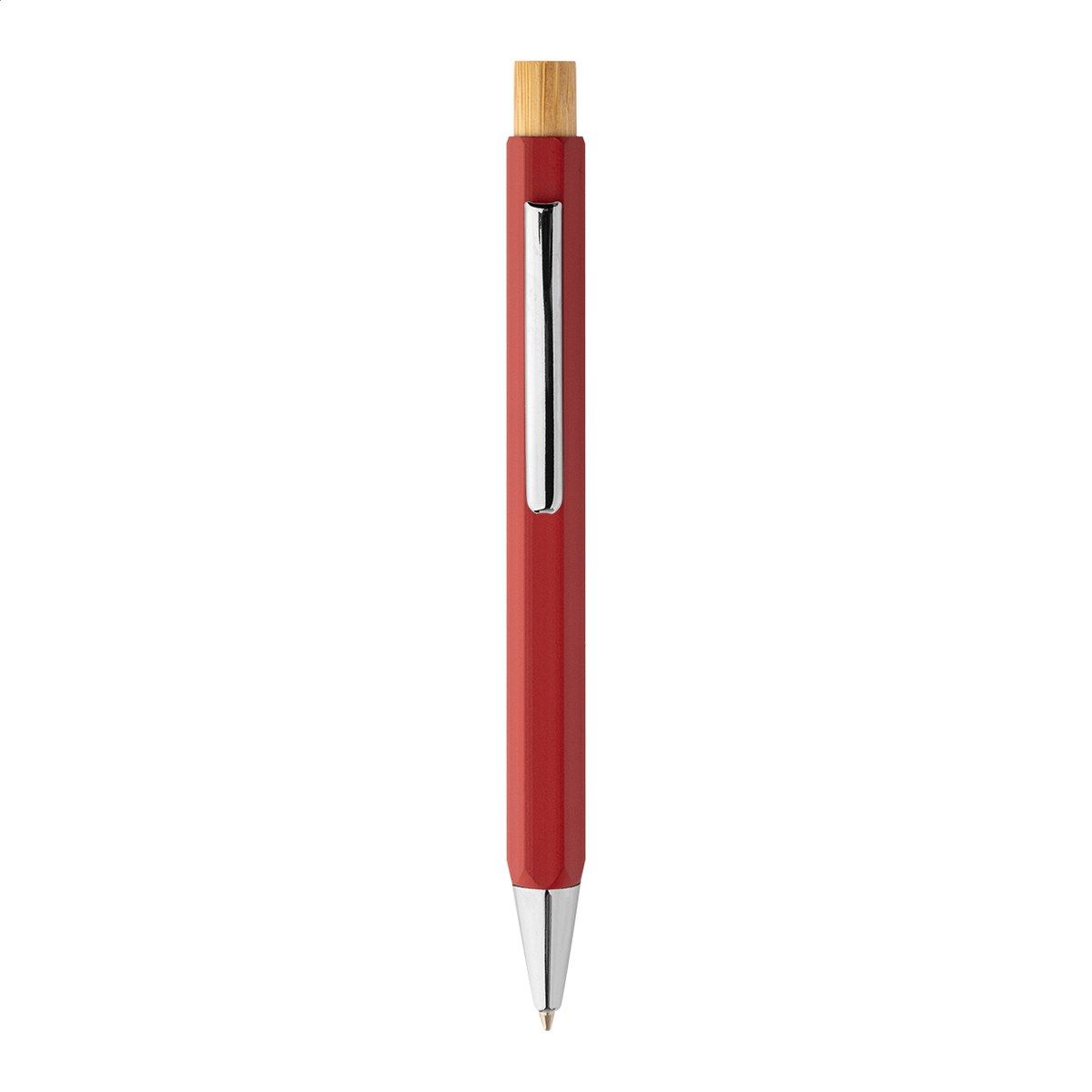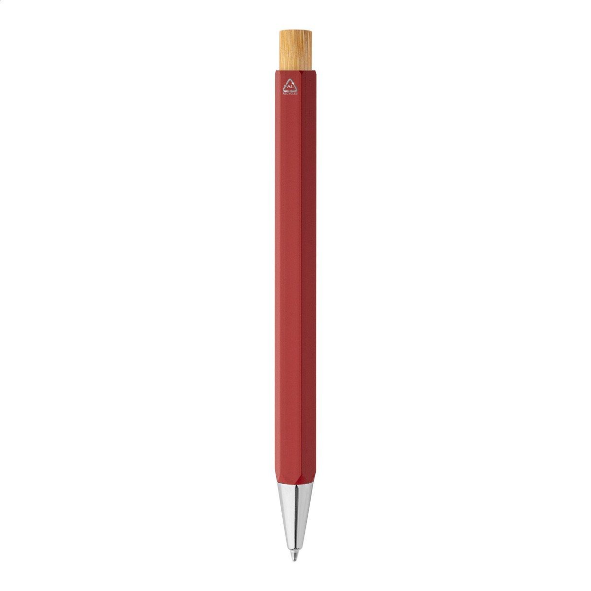 Šestihranné kuličkové pero z recyklovaného hliníku s bambusovým tlačítkem a chromovanými částmi. S modrou náplní.