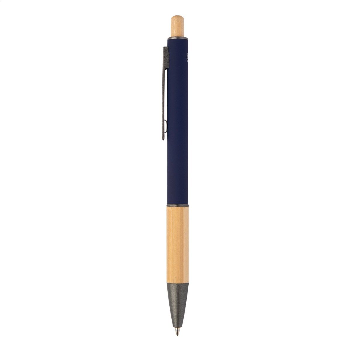 Kuličkové pero z recyklovaného hliníku s bambusovým úchopem a tlačítkem, pogumovaným tělem a kovovými částmi. S modrou náplní.
