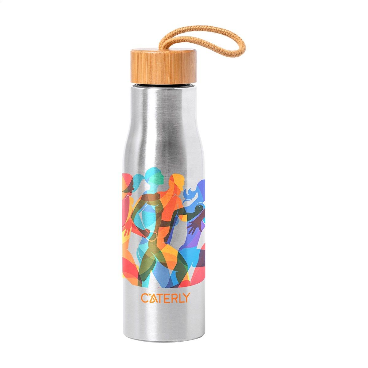 Láhev z nerezové oceli s bambusovým uzávěrem a popruhem, 550 ml.
