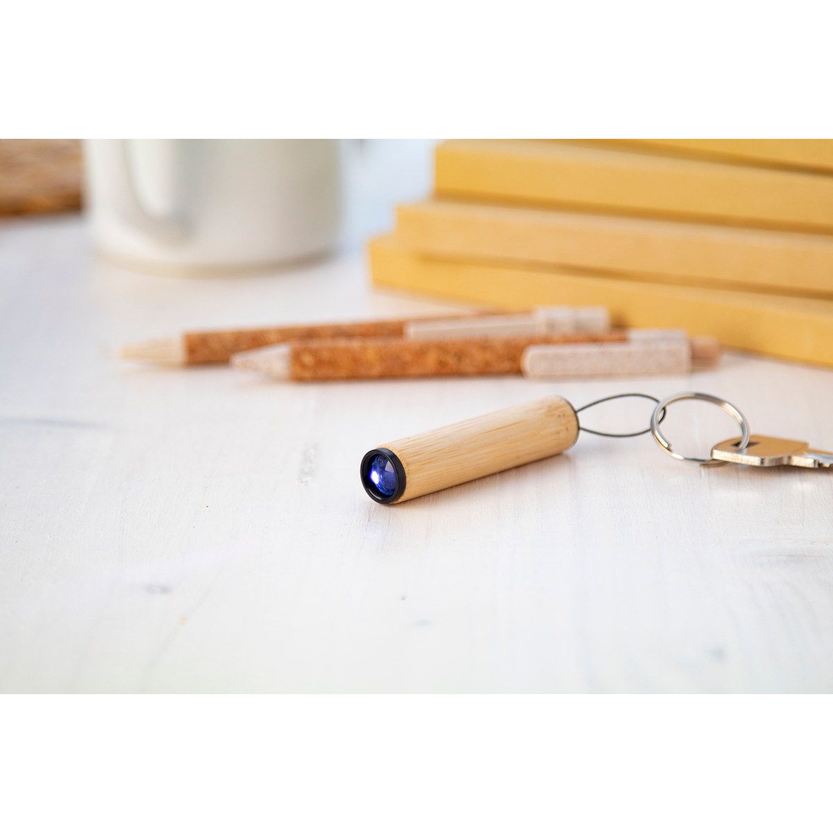 Bambusová mini baterka s 1 LED a kovovým kroužkem na klíče. S knoflíkovou baterií.
