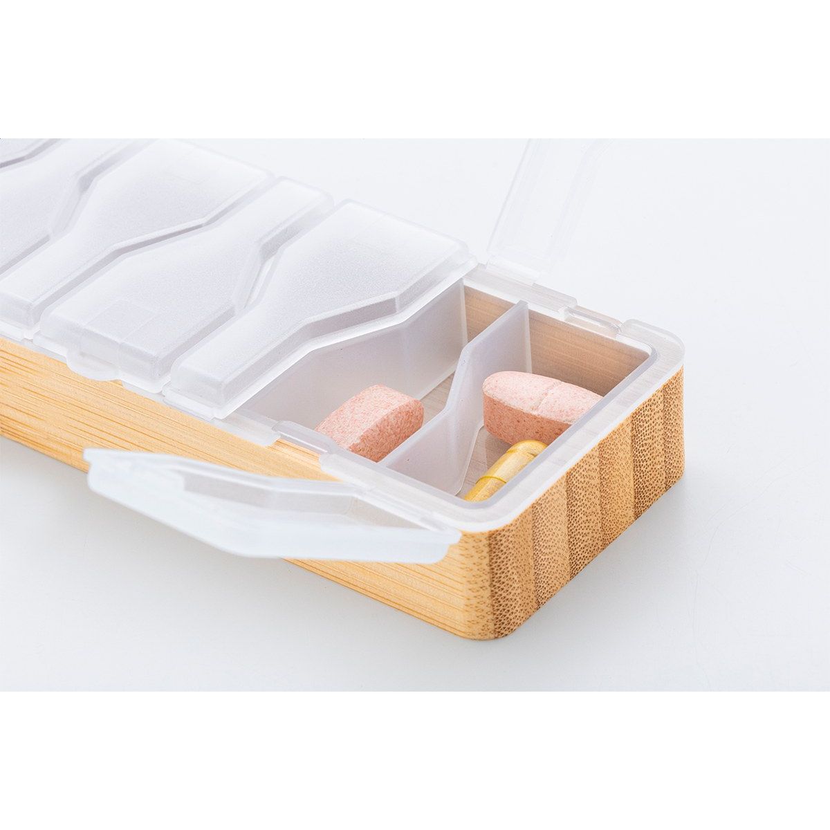 Bambusová a PP plastová týdenní krabička na pilulky se 7 přihrádkami.