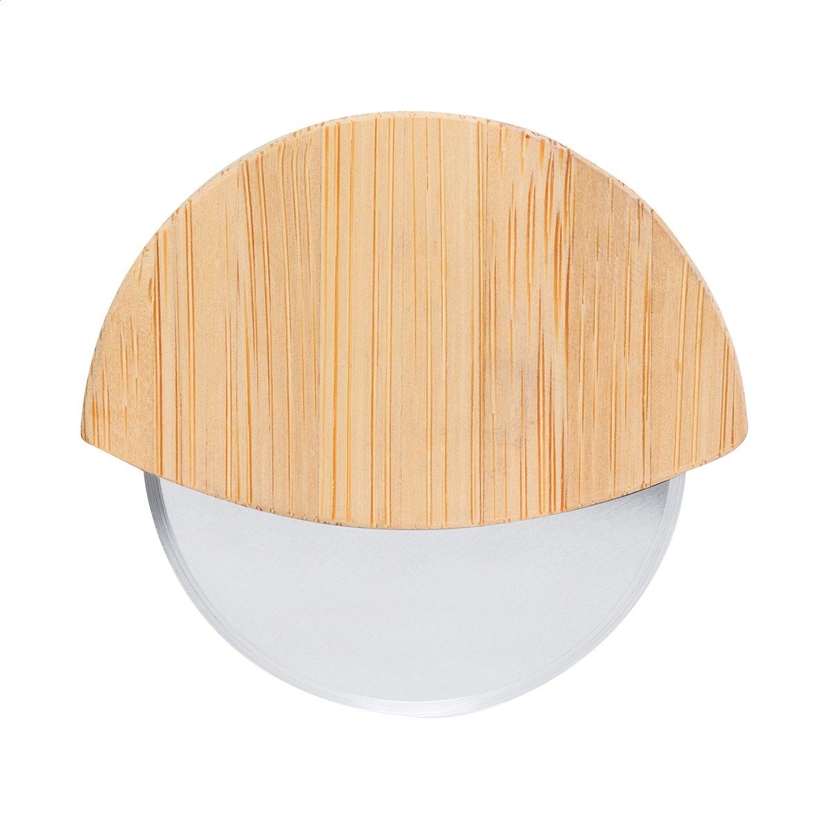 Kráječ na pizzu z nerezové oceli v bambusovém pouzdře.