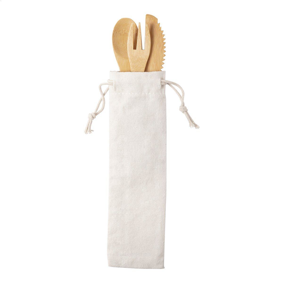 Sada 3ks příborů z bambusu v bavlněném obalu.