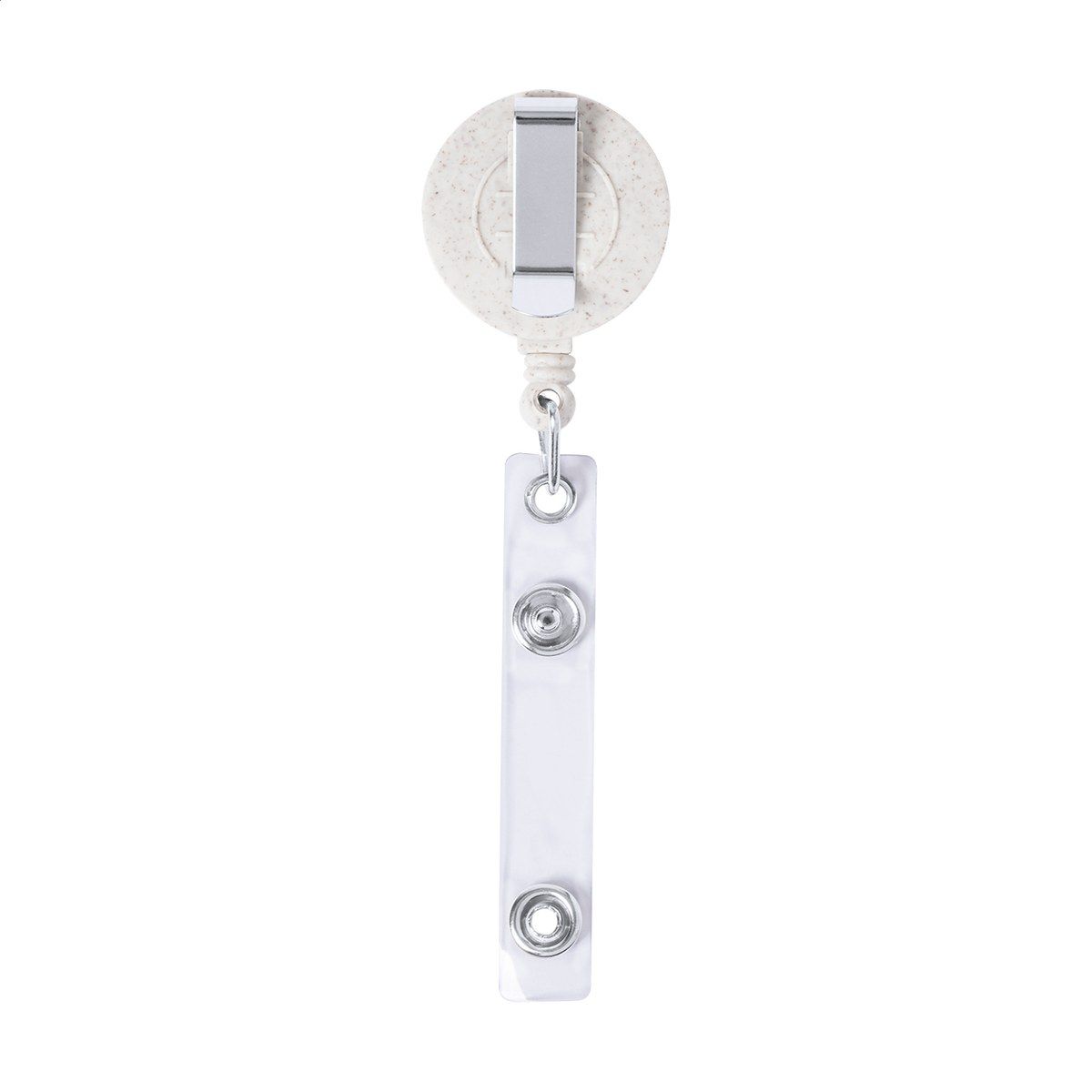 Ekologický držák z pšeničné slámy z plastu a bambusu se zapínáním na druky, teleskopickou šňůrou a kovovou sponou.