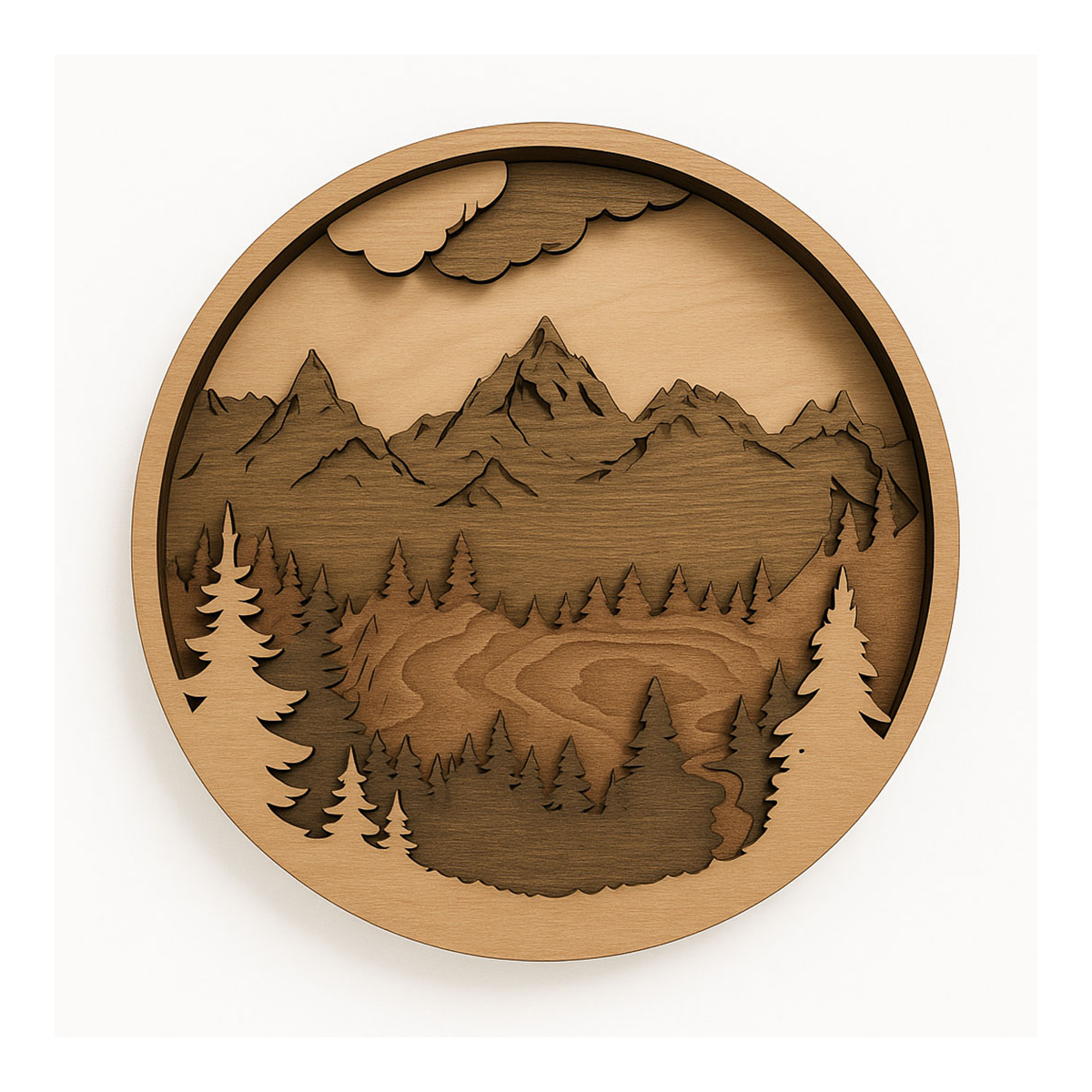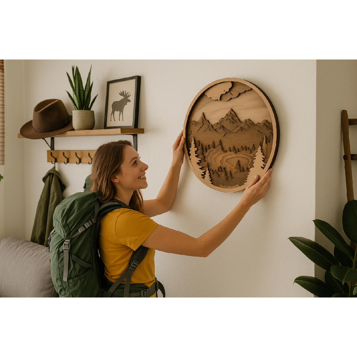 Tato jedinečná dřevěná dekorace zachycuje krásu horské krajiny v detailním vícevrstvém provedení. Precizní laserové vyřezávání dodává motivu hloubku a vytváří dojem skutečného pohledu do hor. Každý kousek je originál, který potěší každého nadšence turistiky, přírody či cestování. Díky svému čistému designu se hodí jak do moderního interiéru, tak do útulné horské chalupy. Skvělý tip na dárek, který zaujme svou originalitou i poctivým zpracováním.