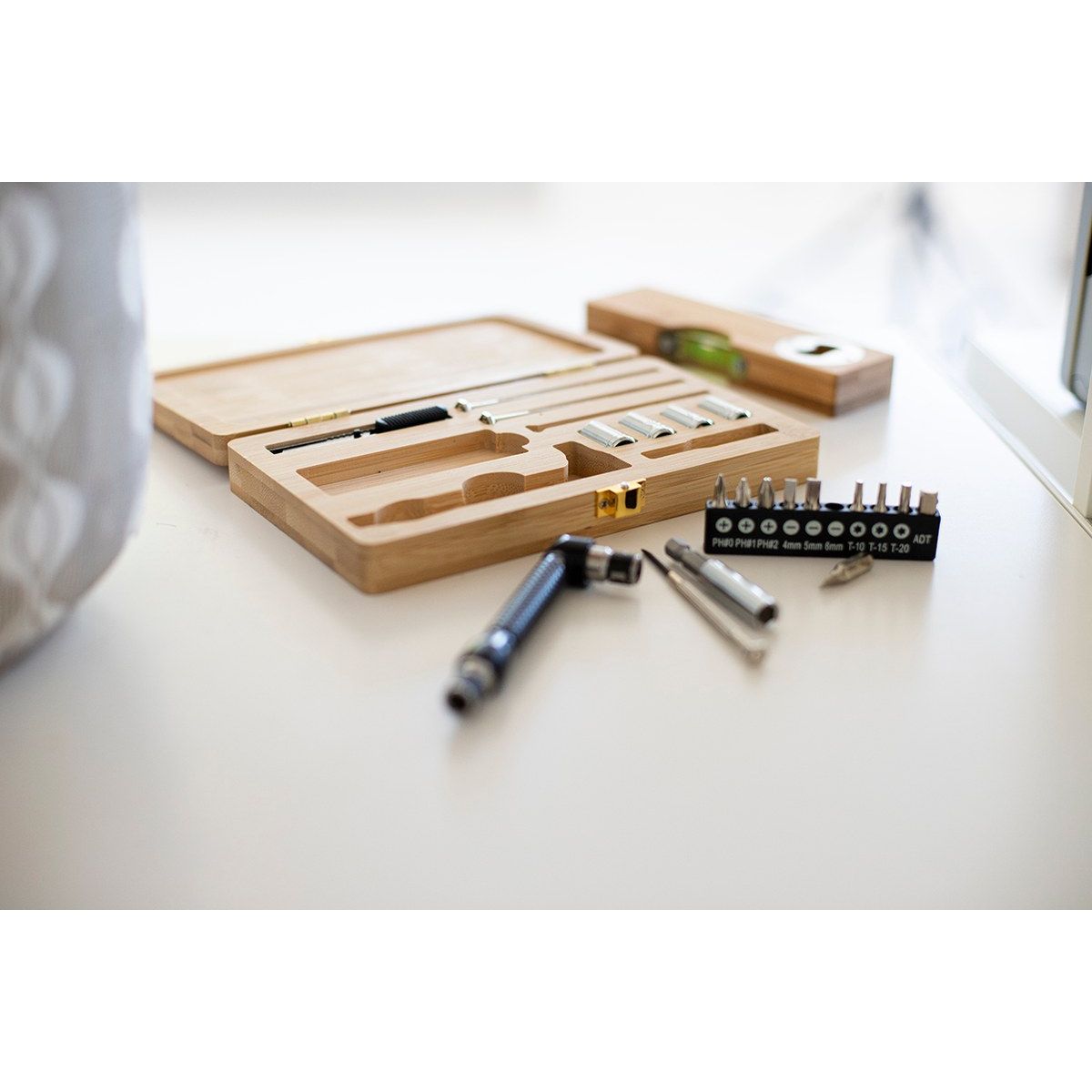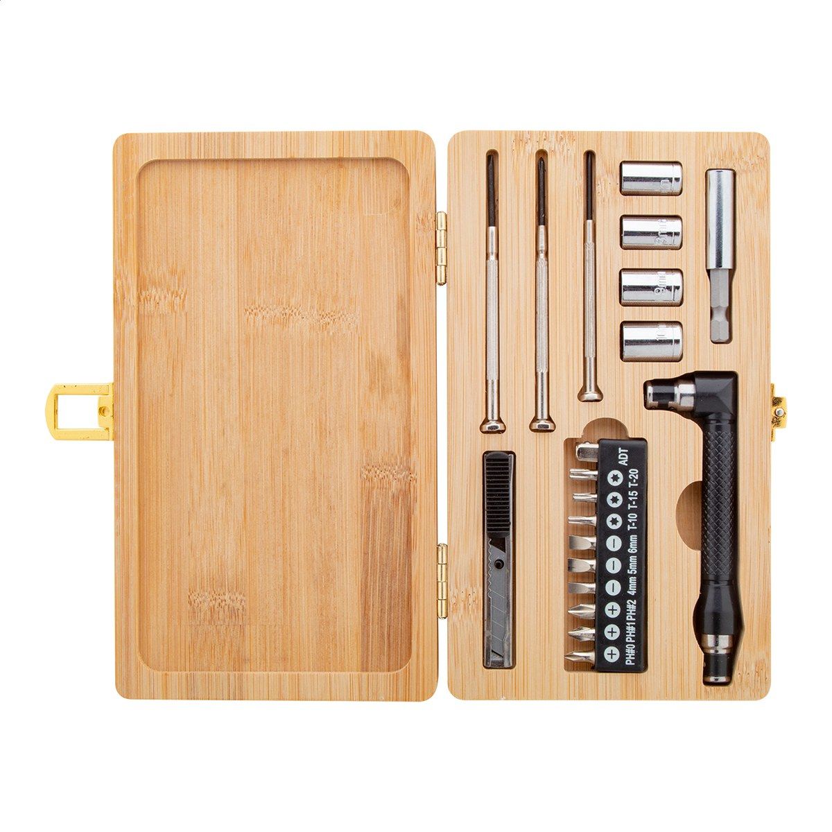 21dílná sada kovového nářadí v bambusové krabičce. Obsahuje 1 nástrčný šroubovák, 1 nůž na papír, 3 přesné šroubováky, 10 ks sada šroubovacích bitů v držáku, 4 ks sada nástrčných matic a 1 nástavec.