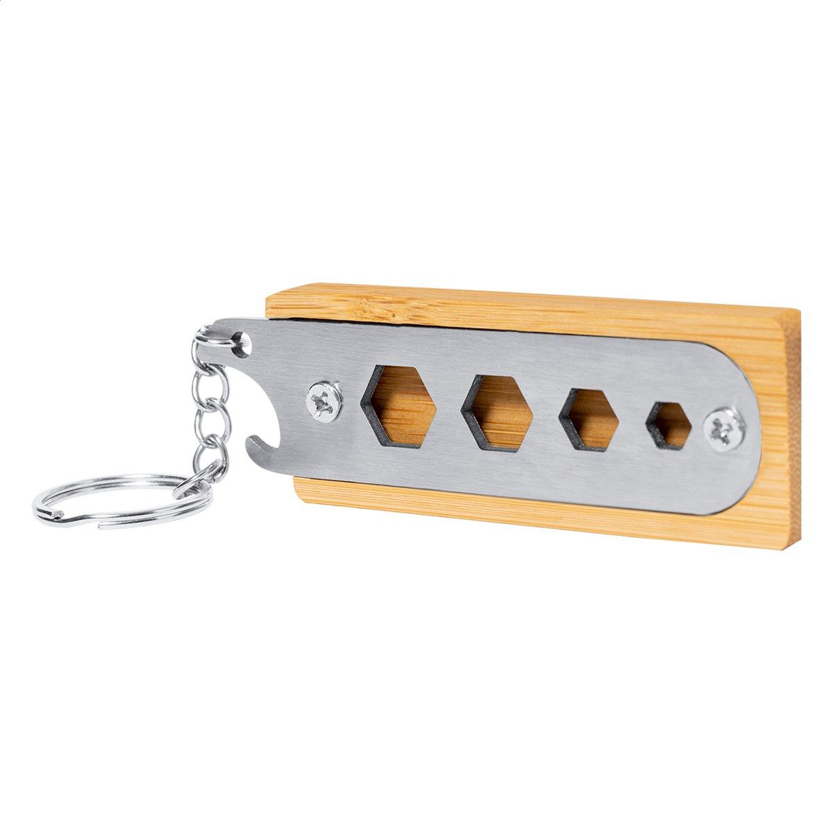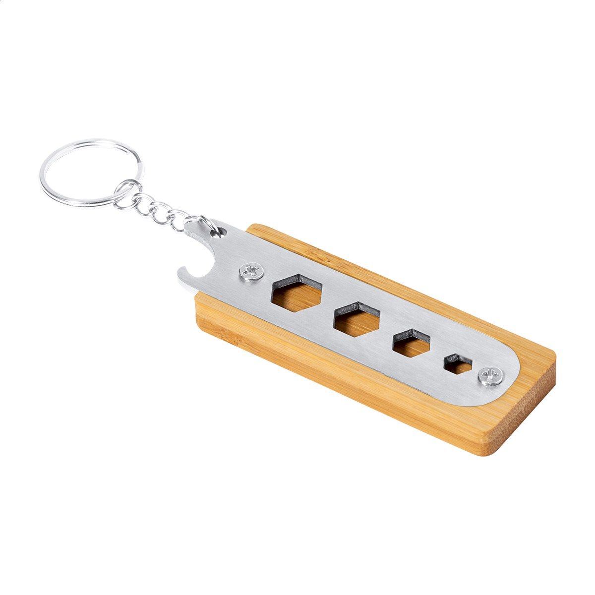 Přívěšek na klíče z bambusu a nerezové oceli s otvírákem na láhve a 4 šestihrannými otvory pro klíče.