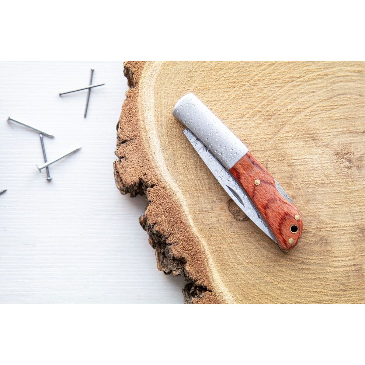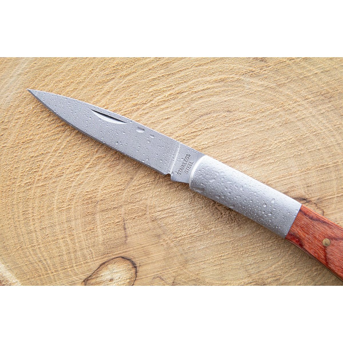 Kapesní nůž z nerez oceli s dřevěnou rukojetí.