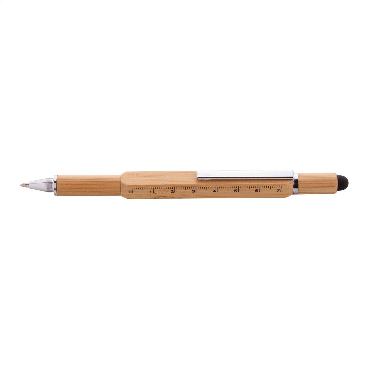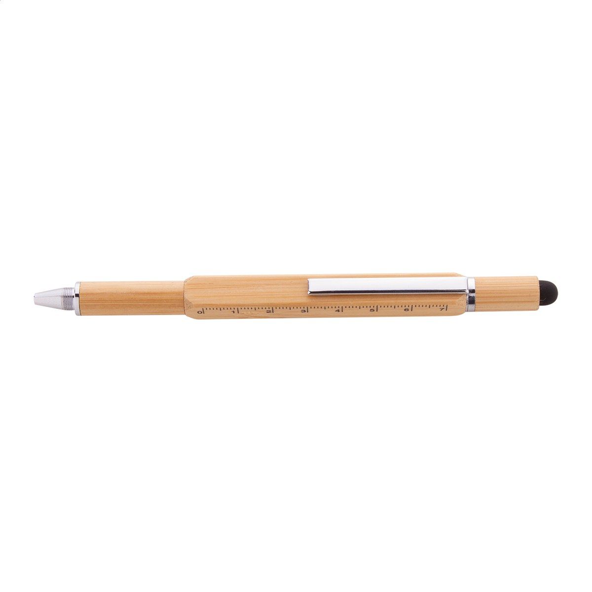 Multifunkční otočné kuličkové a dotykové pero z bambusu. S oboustranným šroubovákem, vodováhou a pravítkem 7 cm. S modrou náplní.